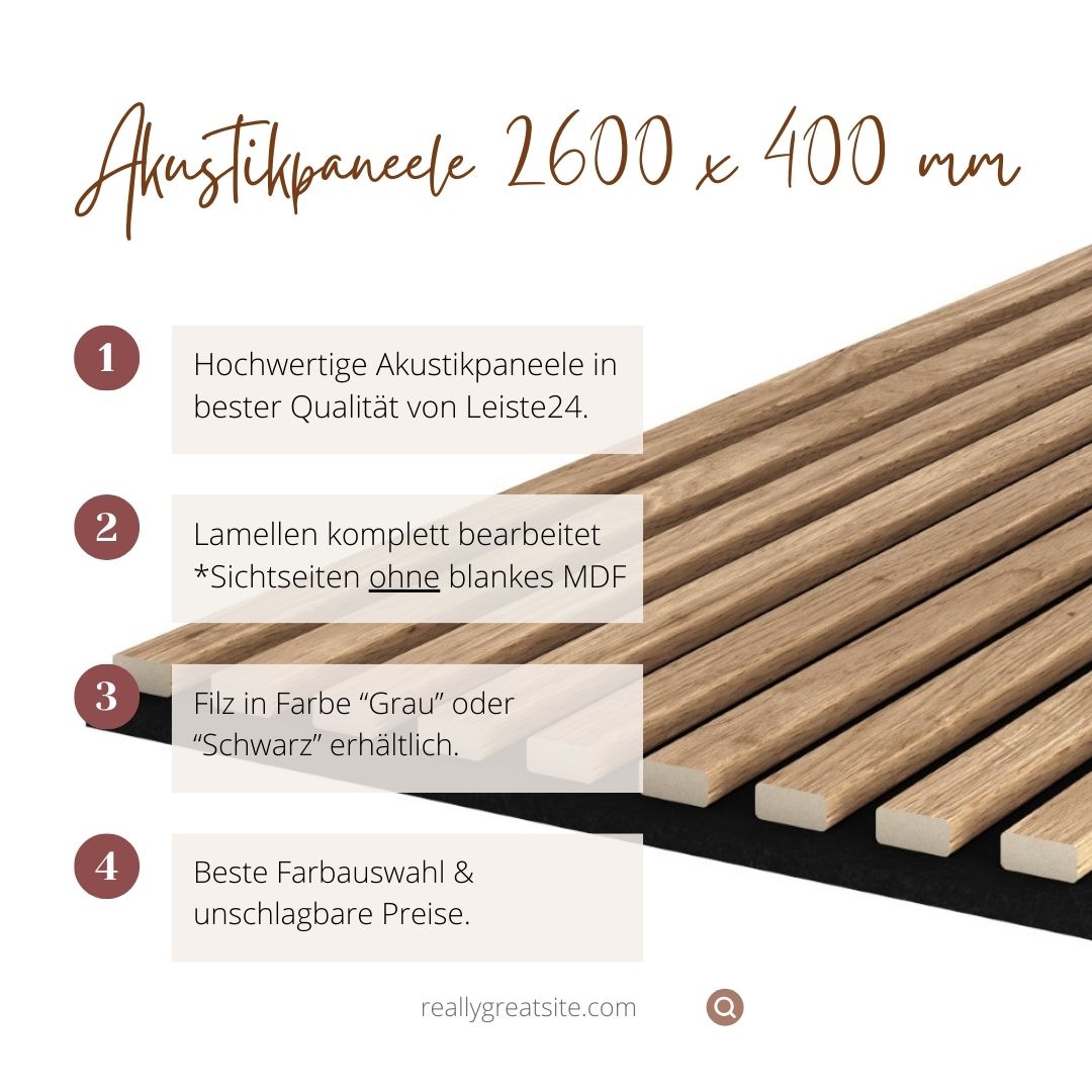 Die Investition in großformatige Akustikpaneele der Größe 2.600 x 400 mm ist eine ausgezeichnete Wahl für jeden, der sowohl die Akustik verbessern als auch das ästhetische Erscheinungsbild eines Raumes aufwerten möchte. Sie bieten eine effektive Lösung zur Lärmreduktion und tragen zu einem gesünderen und angenehmeren Raumklima bei.