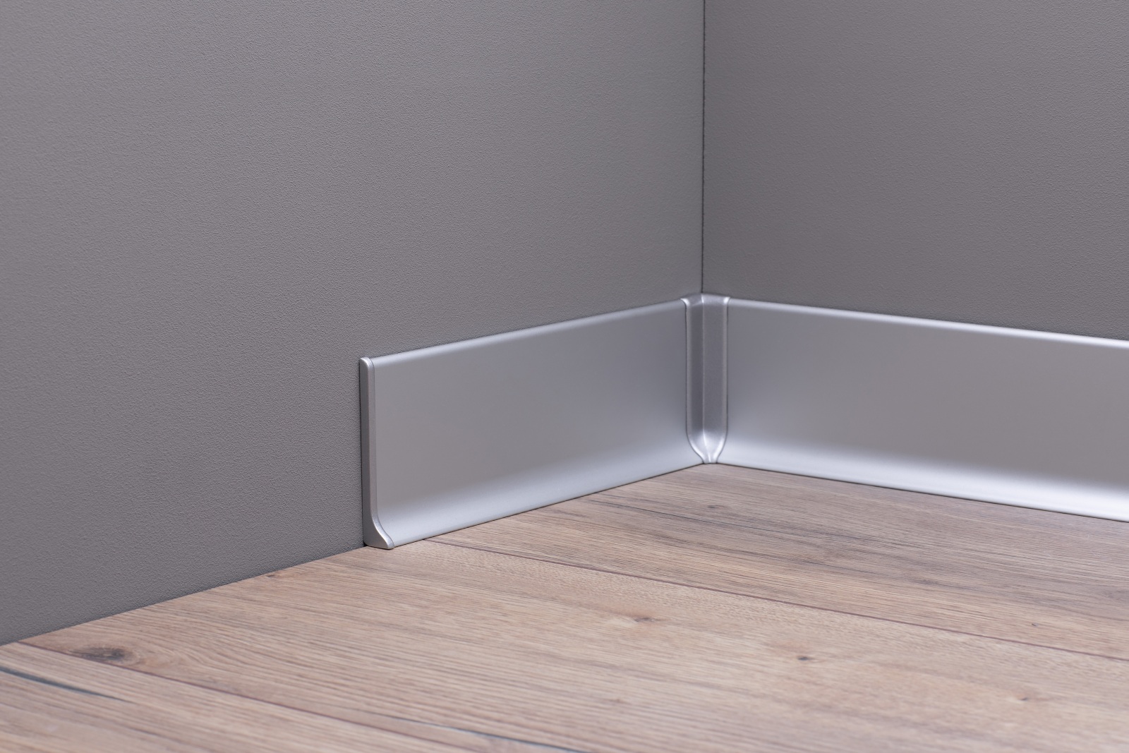 Metallsockelleiste 70 mm in Silber, für einen eleganten und ansprechend aussehenden Übergang zwischen Wand und Boden. Die Sockelleiste ist aus hochwertigem Aluminium gefertigt und damit äußerst stabil, sowie beständig.