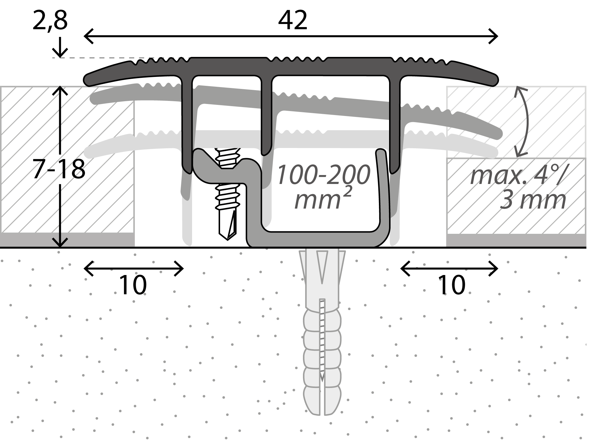 Die Montage ist besonders flexibel: das Unterprofil kann geschraubt oder geklebt werden, das Oberprofil wird gesteckt oder geschraubt - mit automatischer Anpassung an die Höhe.