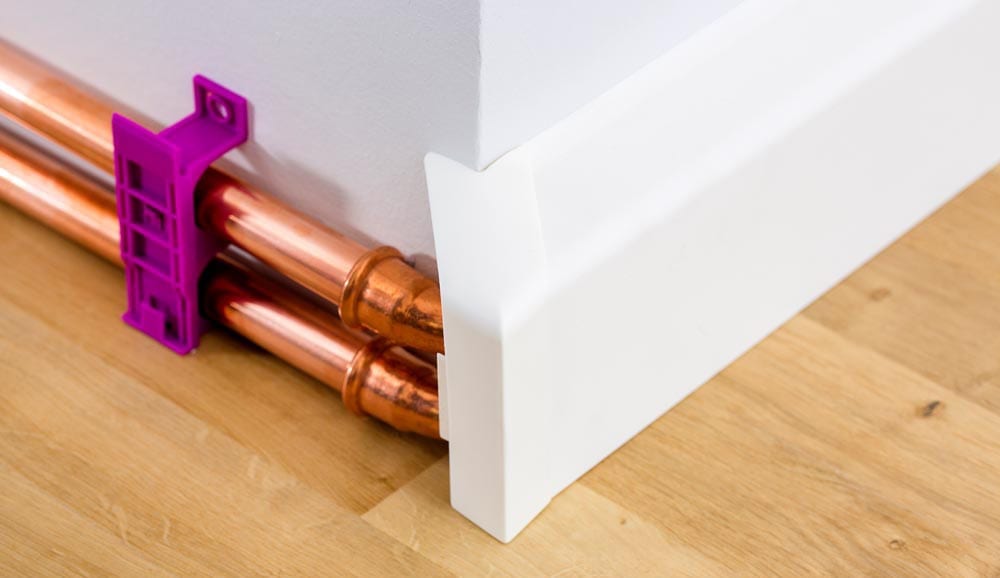 Die Heizungsrohrverkleidung wird mit Hilfe von speziellen Befestigungsschellen montiert. Diese sind für bis zu 2 Rohre mit einem maximalen Durchmesser von 28mm geeignet.