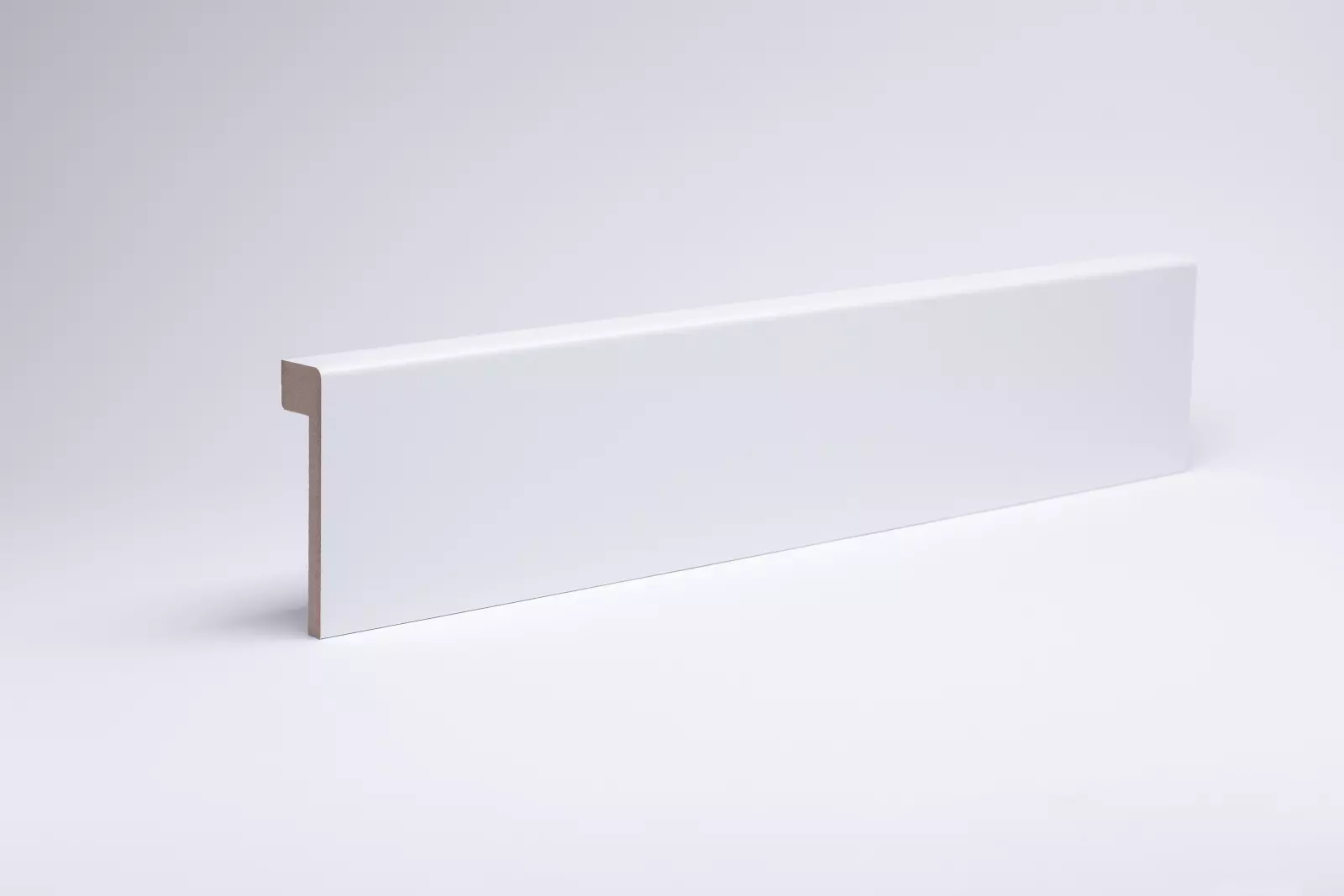 Unsere Abdeckleiste für Fliesensockel 80mm in Weiß in der Abmessung 19 x 80 x 2.600 mm verschönern durch ihr schlichtes und modernes Design jeden Raum. Die Rückseite besitzt eine Ausfräsung von 13 x 65 mm.