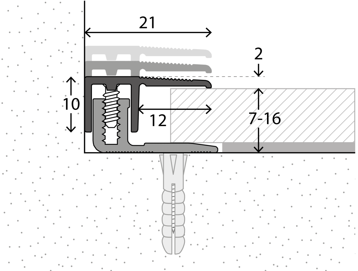 Die Montage ist besonders schnell und einfach. Das Aluminium - Basisprofil wird auf den Untergrund befestigt und der Bodenbelag verlegt. Das Oberprofil wird mit den beiliegenden selbstschneidenden Bohrschrauben auf dem Unterprofil befestigt. Das Oberprofil passt sich dabei stufenlos dem Bodenbelag an und schließt automatisch an beiden Seiten dicht ab. Durch den Einsatz der Selbstbohrschraube, erhalten Sie ein Profilsystem mit optimalen Kraftschluss, auch nach mehrjähriger Druck- und Zubelastung und ist damit für höchste Belastung geeignet.