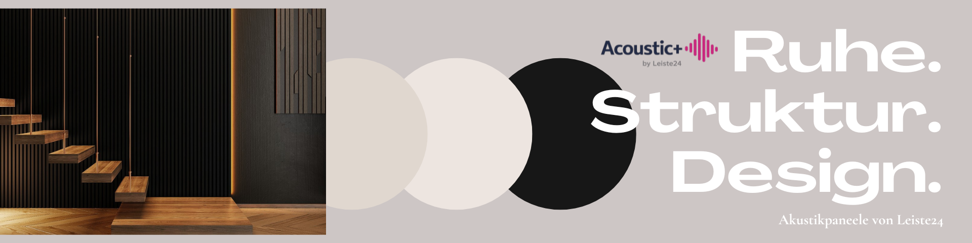 Acoustic+ Akustikpaneel 3000 x 400 mm Eiche Natur - Akustikfilz Schwarz Hochwertige Akustikpaneele mit CleanEdge-Technologie - keine sichtbaren Kanten, moderne Lamellenoptik und spürbar bessere Raumakustik Großformatige Acoustic+ Akustikpaneele im Maß 3000 x 400 mm sorgen für eine besonders ruhige, durchgängige Wandoptik ohne störende Übergänge. Die Kombination aus moderner Lamellenoptik, funktionaler Schalldämmung und CleanEdge-Technologie macht sie zur idealen Lösung für hochwertige Wandgestaltungen. CleanEdge-Technologie - der sichtbare Unterschied Voll ummantelte Lamellen ohne offene Schnittkanten Saubere, hochwertige Optik aus jedem Blickwinkel Deutlich edler als herkömmliche Akustikpaneele mit sichtbaren MDF-Kanten Warum Acoustic+ Akustikpaneele von Leiste24? Verbessern die Raumakustik spürbar Moderne Lamellenwand-Optik für mehr Tiefe und Struktur Einfache Montage durch Kleben oder Schrauben Hochwertige Verarbeitung für langlebige Wandlösungen Produktdetails Lamellen aus MDF mit Qualitäts-Dekorkaschierung in Eiche Natur Maße: 3000 x 400 x 20 mm Filz: Schwarz (8 mm stark) Material: MDF Maße der Lamellen: 27 mm breit und 12 mm stark Abstände zwischen den Lamellen: 18 mm Wandpaneele komplett vormontiert Montage Die Lamellenverkleidung ist sehr schnell und einfach zu montieren. Entweder Sie kleben oder schrauben die Akustikpaneele an die Wand. Für die Decke empfehlen wir Kleben und Schrauben in Kombination. Die perfekte Kombination aus Design und Funktion - für Räume, die nicht nur gut aussehen, sondern sich auch besser anfühlen.