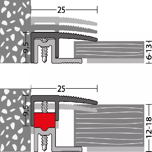 Das Aluminium - Clipsprofilsystem ist konstruiert für Belagstärken von 6 bis 13 mm. Mit dem Erhöhungsblock können sie sogar Belagsstärken bis 18mm abdecken.