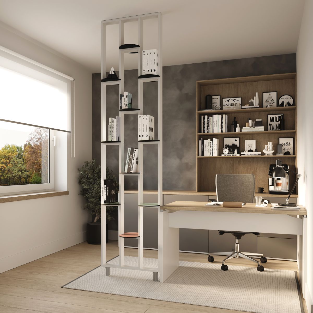 Der Design Raumteiler in moderner Farbe Weiß überzeugt als stilvolles Regalsystem und funktionaler Raumtrenner. Mit seinem klaren, minimalistischen Design fügt er sich perfekt in moderne Wohn- und Arbeitswelten ein und schafft elegante Raumstrukturen, ohne den Raum optisch zu verkleinern.