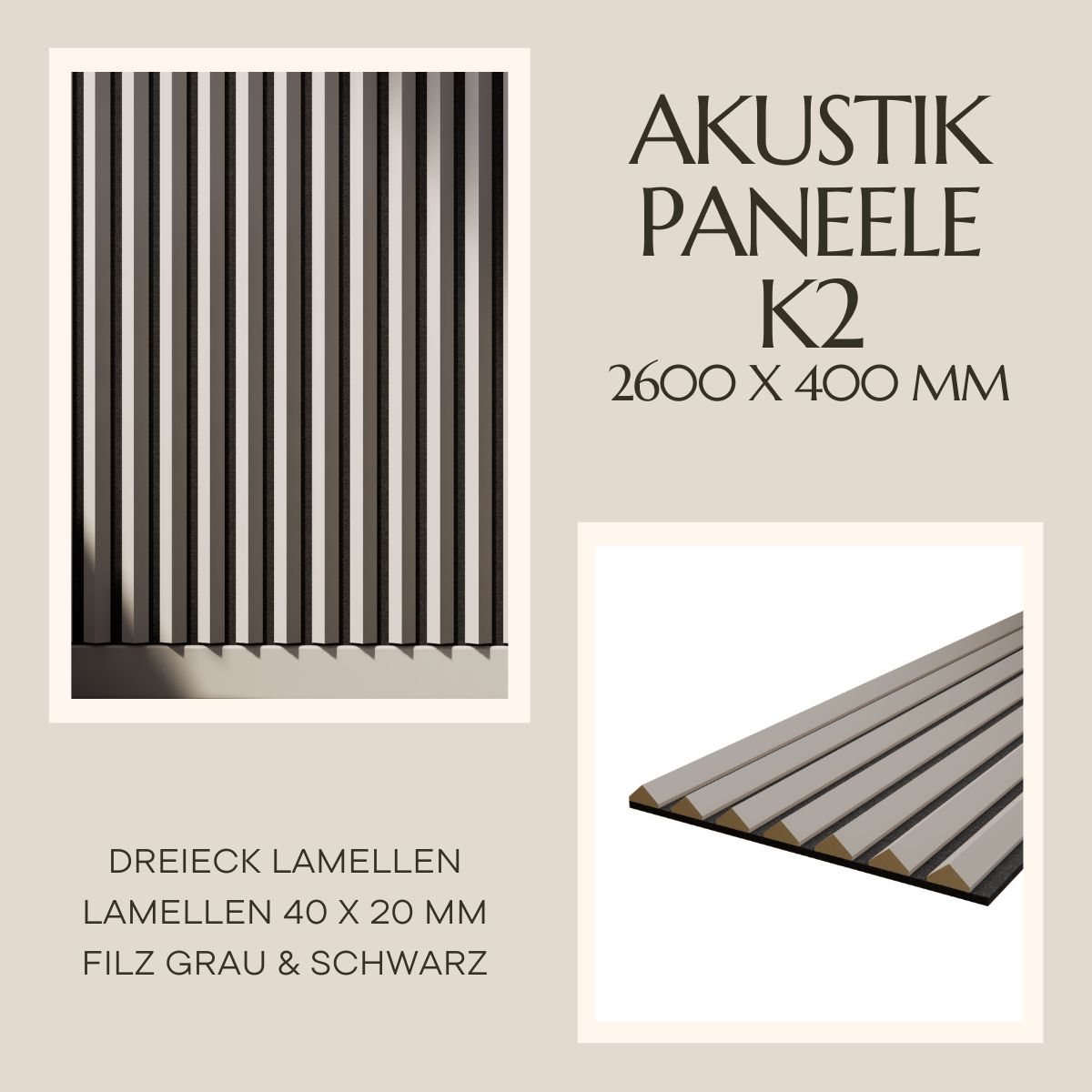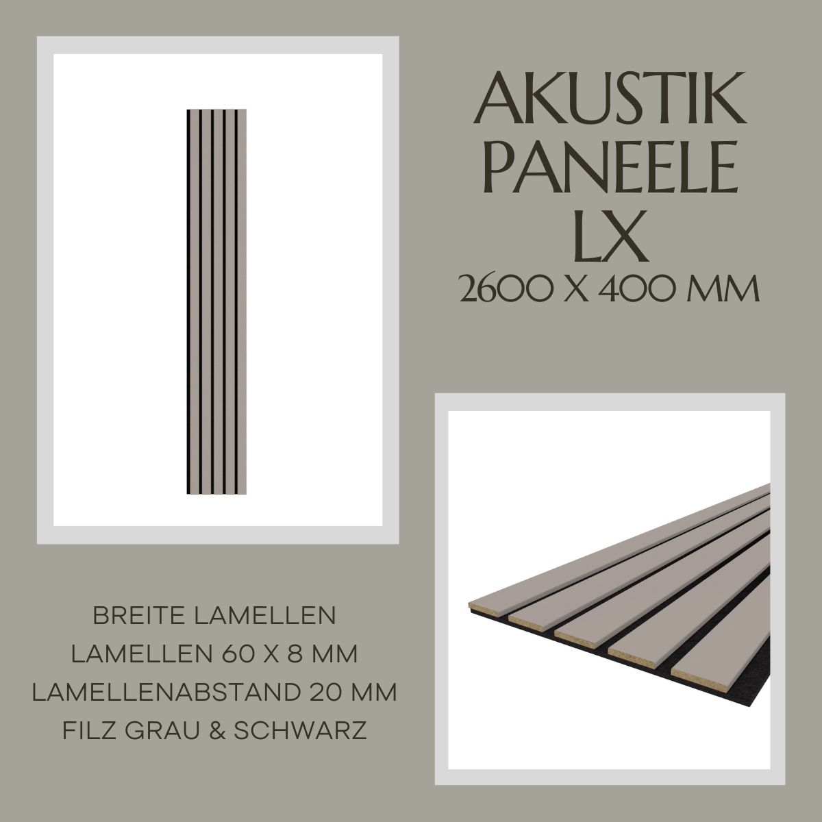 Lamellenverkleidung - Wandverkleidung - LX Akustikpaneel 2600 x 400 mm - Akustikfilz Grau