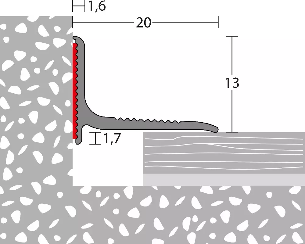 Nach dem Aushärten des Klebstoffs kann der Bodenbelag passend an das Profil angeschnitten werden. Wir empfehlen dieses Profil nur in Verbindung mit verklebten Bodenbelägen zu nutzen.