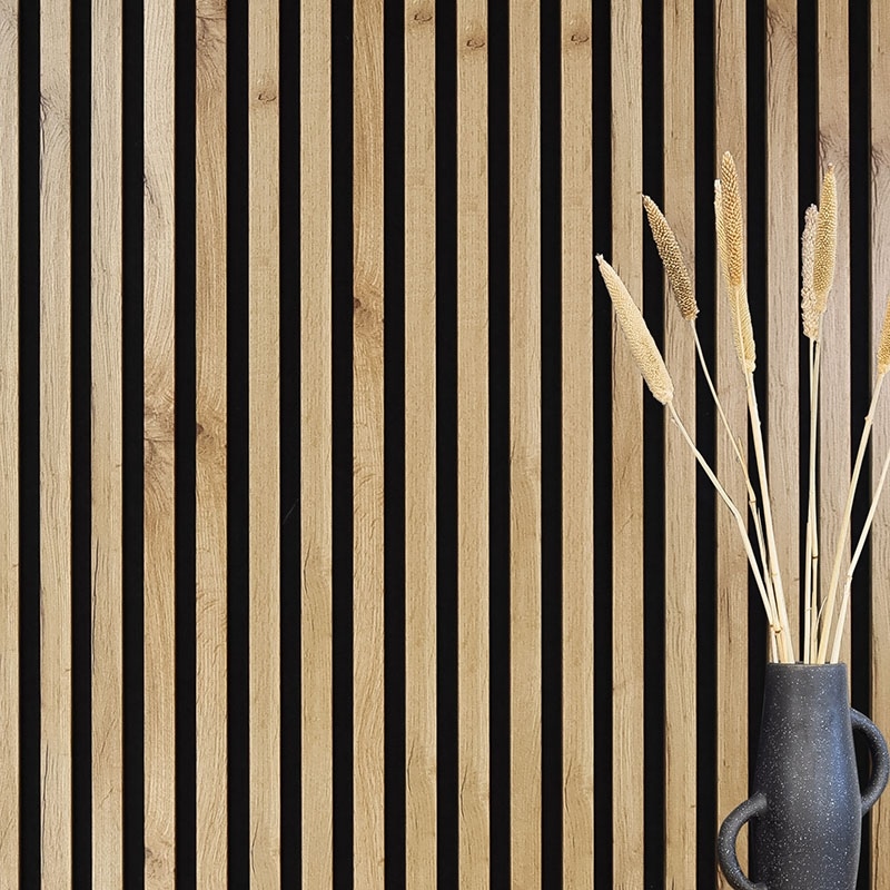 - MDF slats with high-quality wild oak decorative laminate