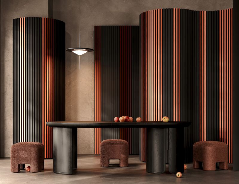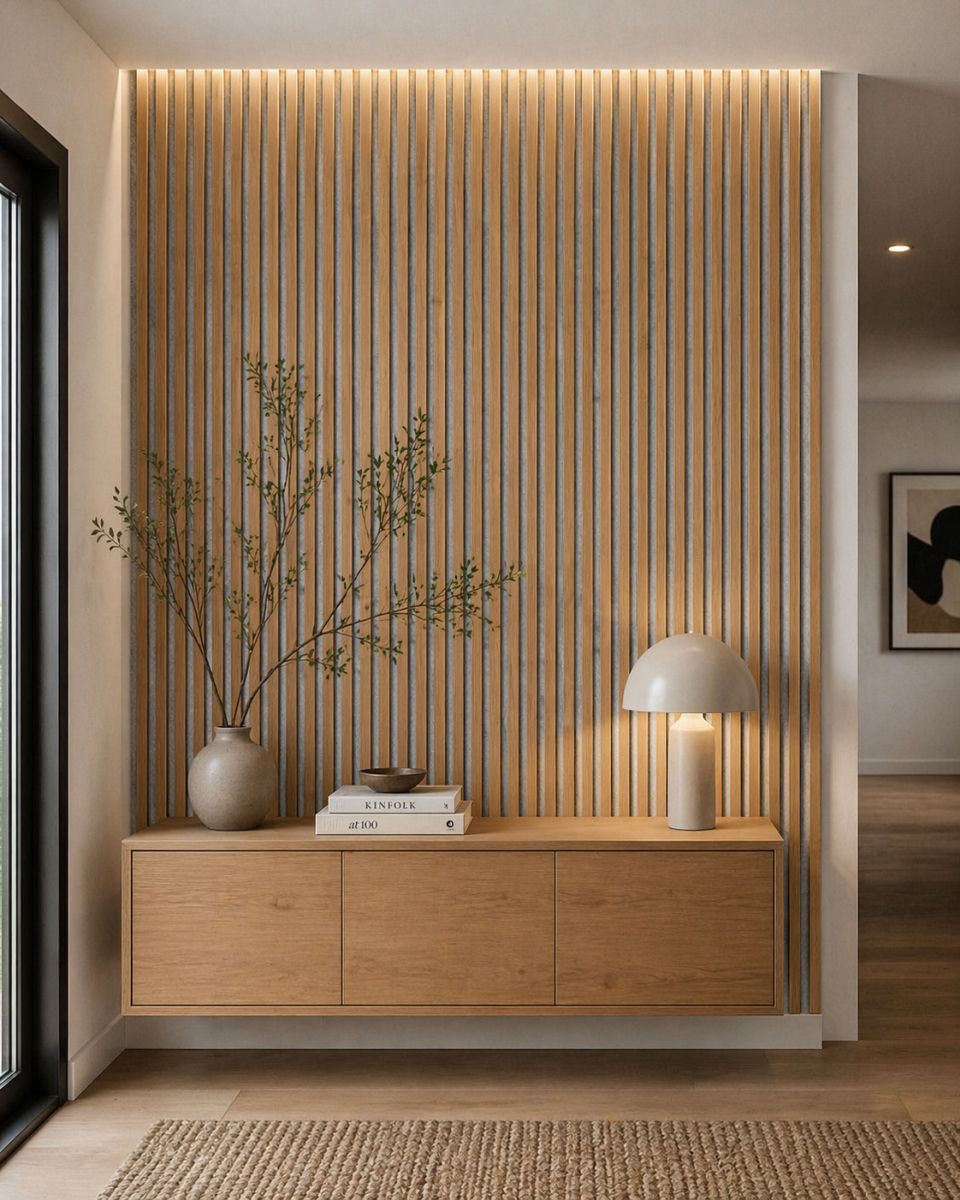- Modern slatted wall design for added depth and structure