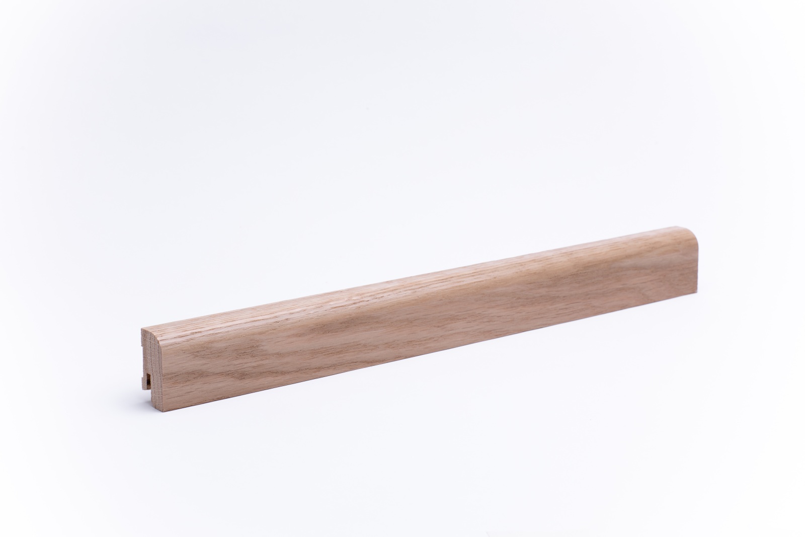 Skirting board made of genuine varnished oak wood with a rounded front edge in the dimensions 40mm x 20mm x 2400mm. The profiles are produced from one piece of wood from the trunk and give rise to a harmonious finish in wood and colour structure.
