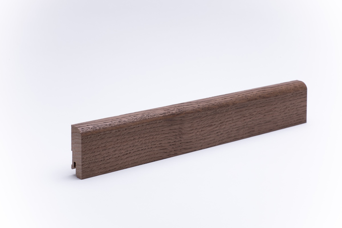 Skirting board made of genuine varnished oak wood with a rounded front edge in the dimensions 60mm x 20mm x 2400mm. The profiles are produced from one piece of wood from the trunk and give rise to a harmonious finish in wood and colour structure.