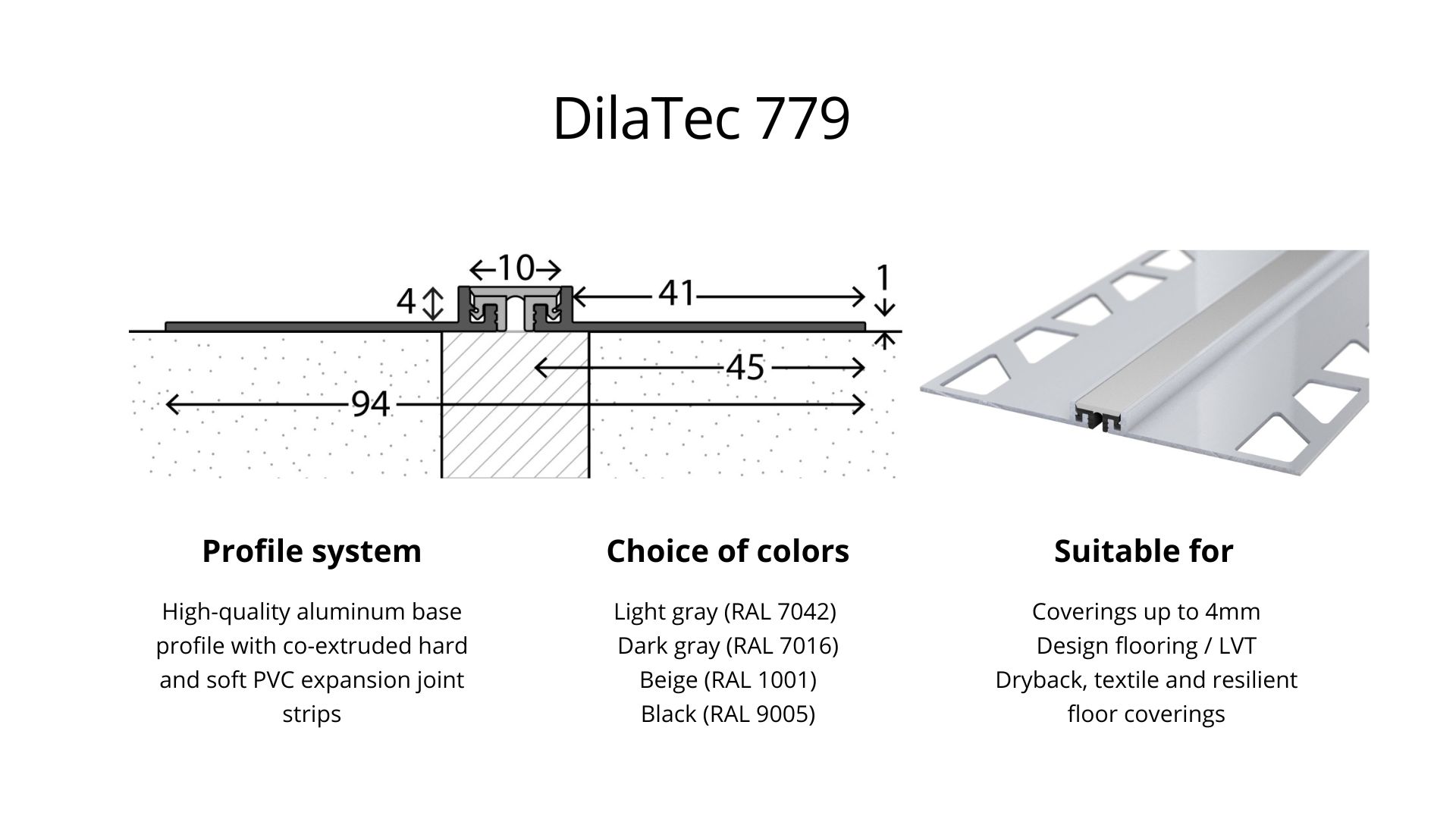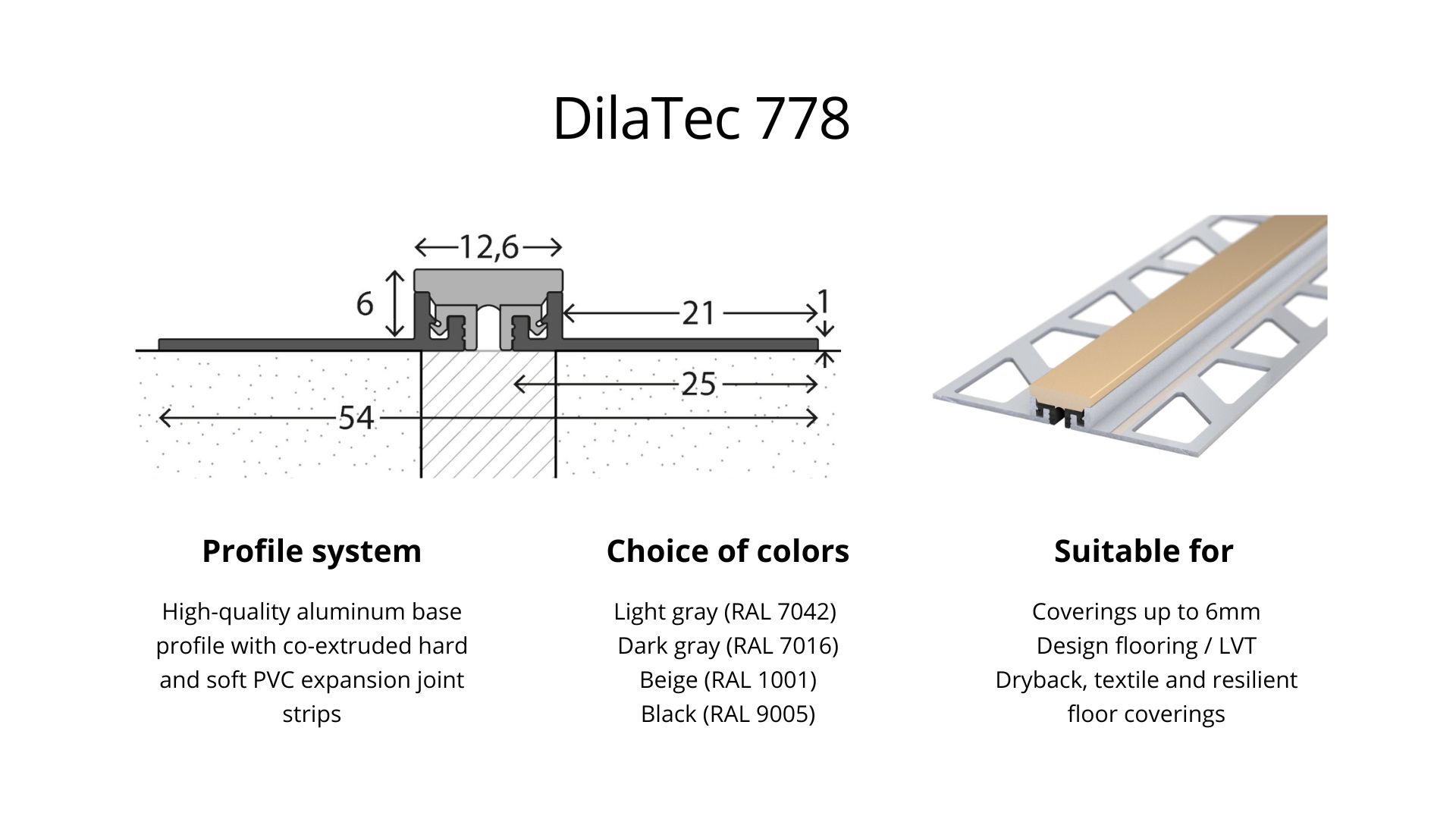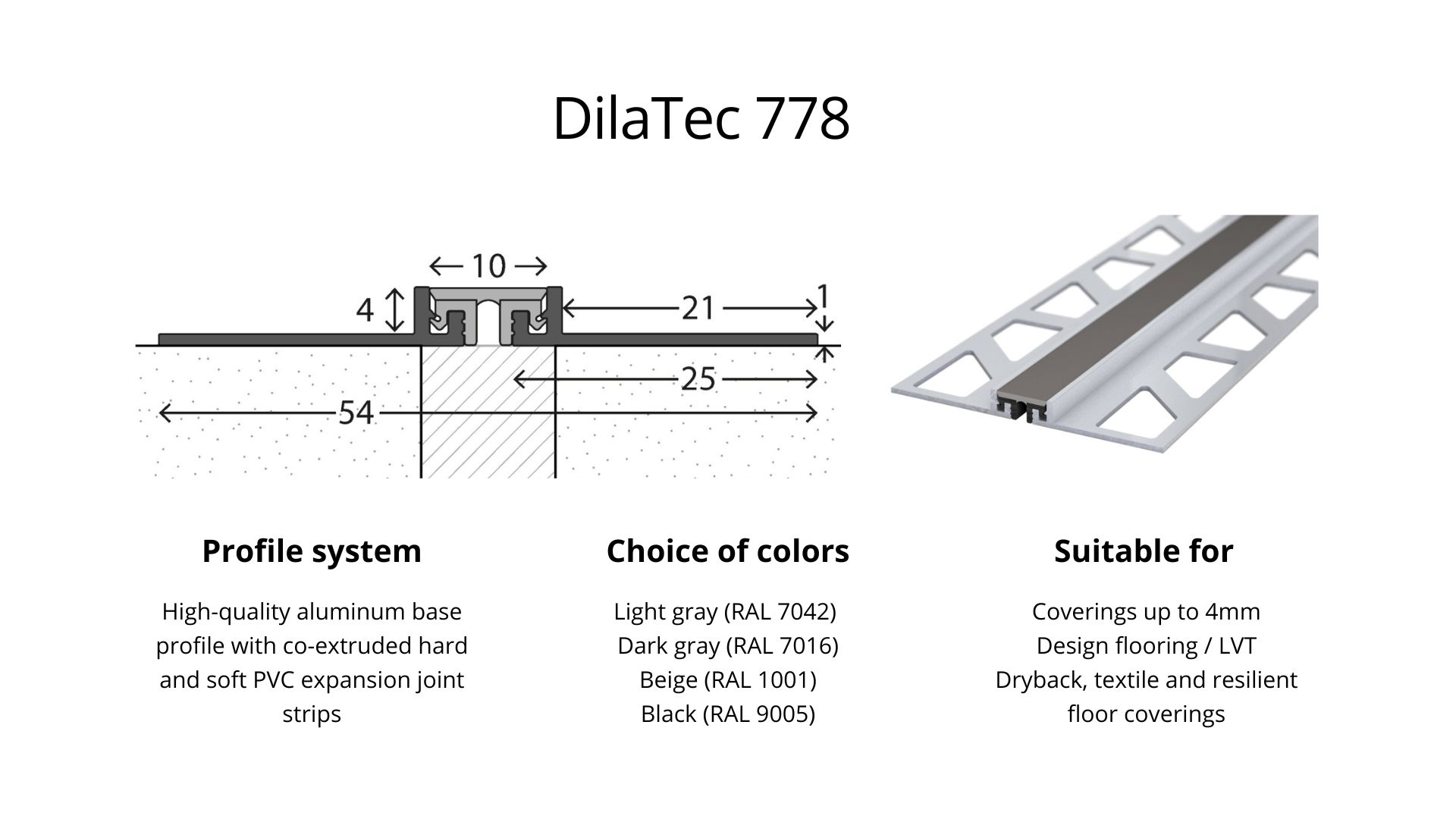 Whether for tiles, laminate, parquet or concrete - our range of expansion joints includes various profiles and widths to suit different floor coverings. Choose from systems such as the DilaTec system, aluminum expansion joints, stainless steel expansion joints and cork strips to find the ideal solution for your requirements.