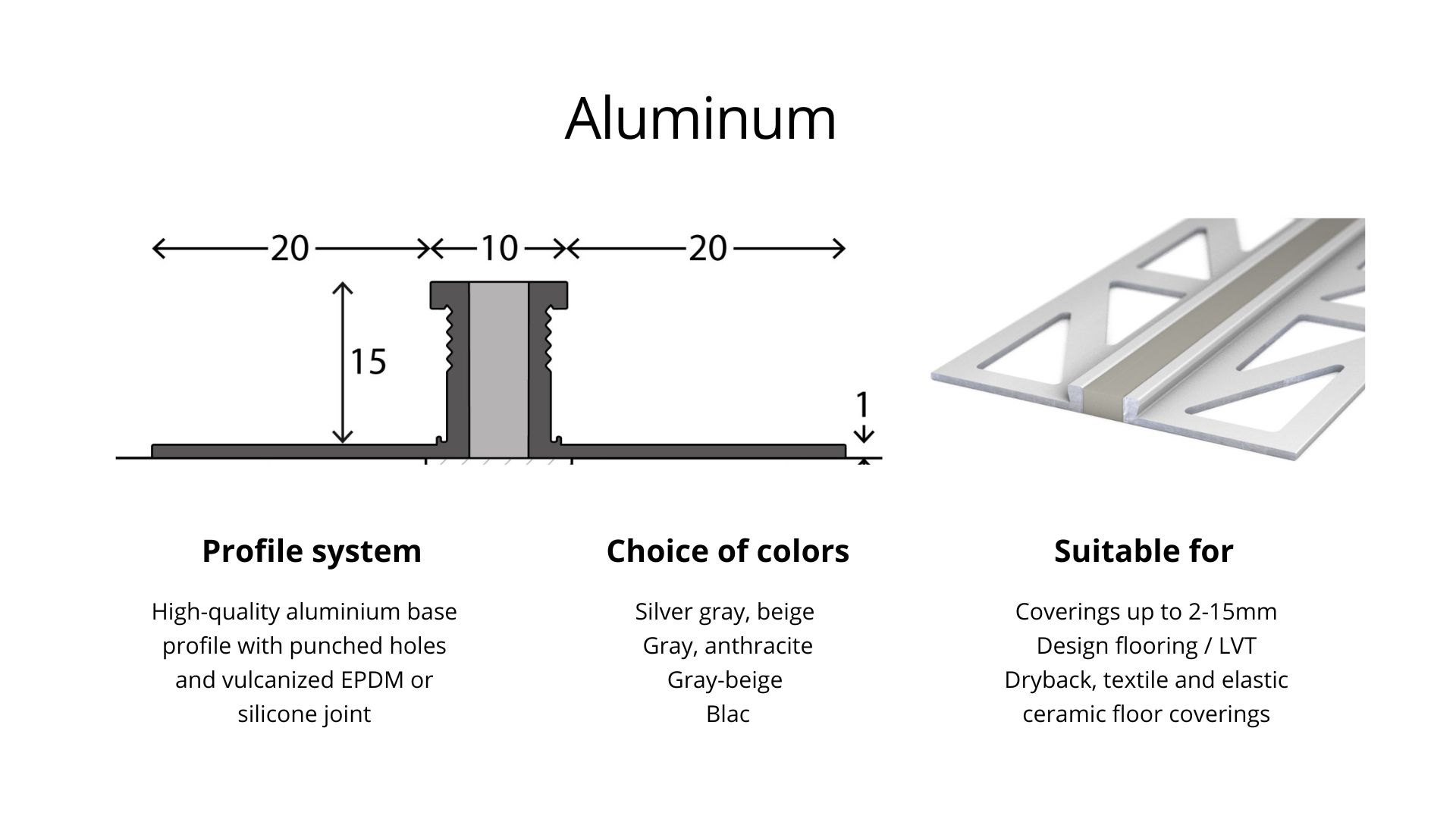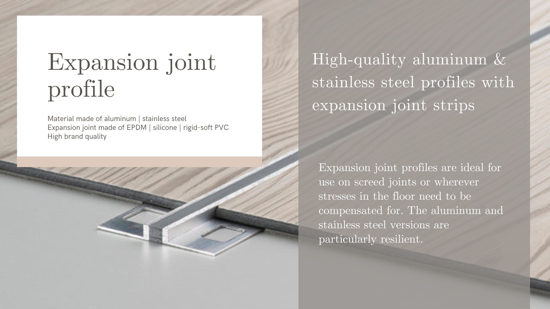 Made of high-quality materials such as aluminum, stainless steel or flexible plastic, our expansion joint profiles are ideal for use in homes, offices, industrial environments and outdoor areas. The materials offer high resistance to stress, moisture and temperature fluctuations and adapt optimally to local conditions.