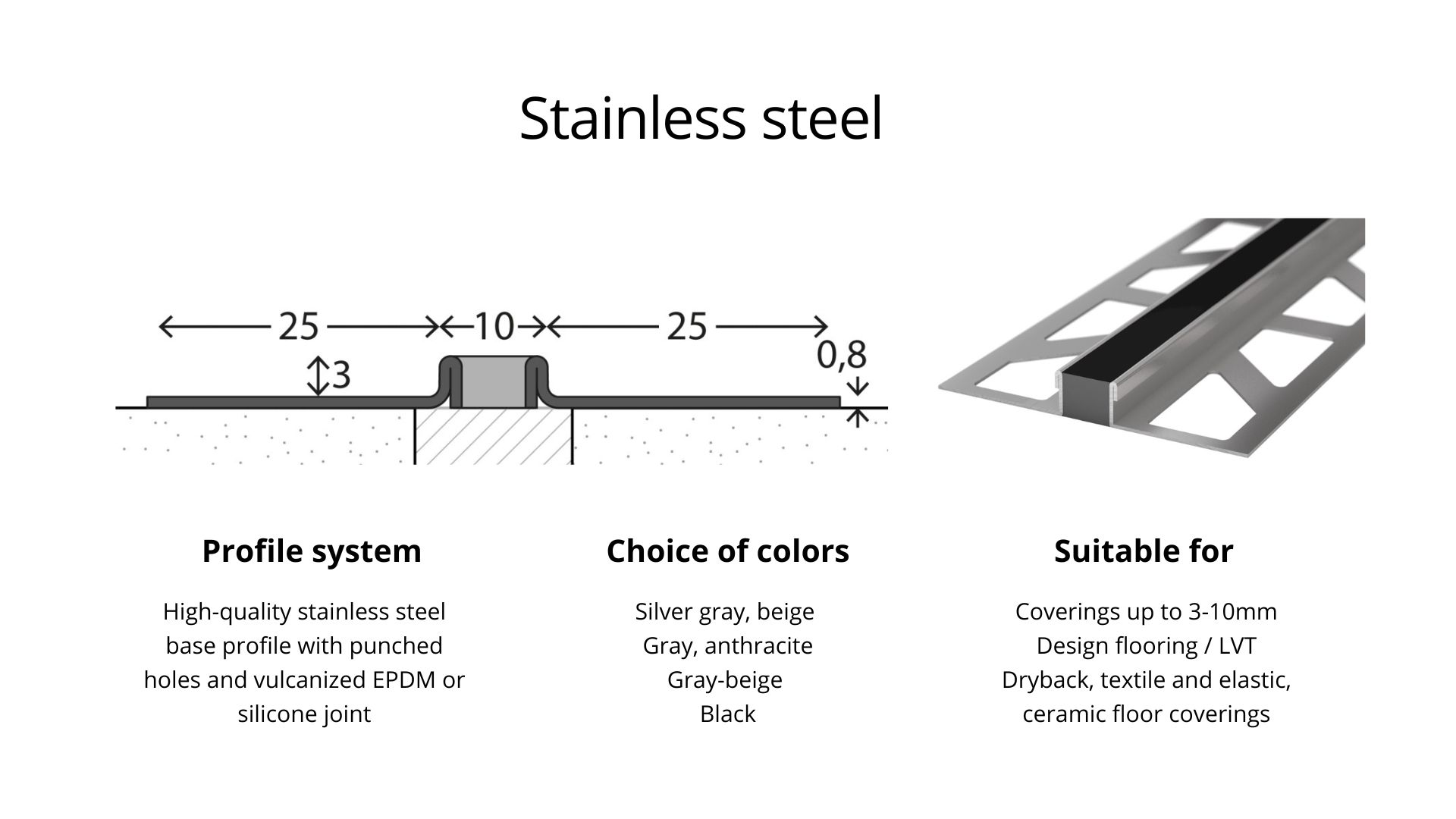 Our expansion joint profiles are easy to install and ensure a clean, professional appearance. The profiles guarantee an aesthetic and functional solution for all joint requirements and are ideal for new buildings as well as renovations. Discover our high-quality expansion joints now and protect your floor and wall coverings from damage.