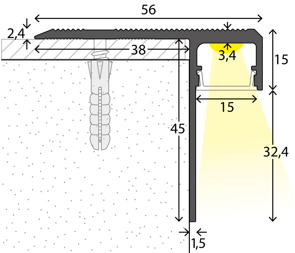 The profile is screwed onto the step edges mentioned above using suitable dowels and countersunk screws to fit precisely onto the existing steps above the laid floor covering. Make sure that there is some space for possible cables for the