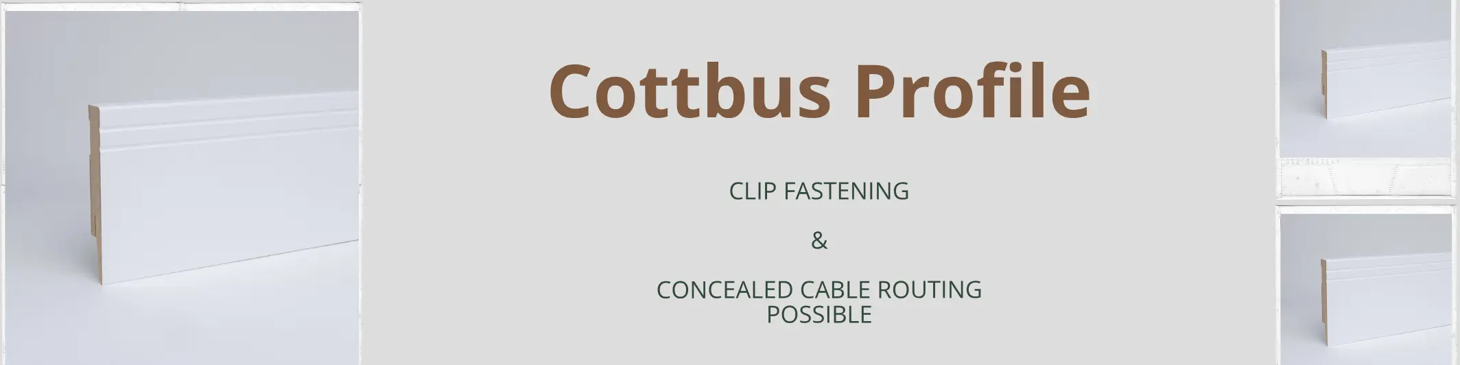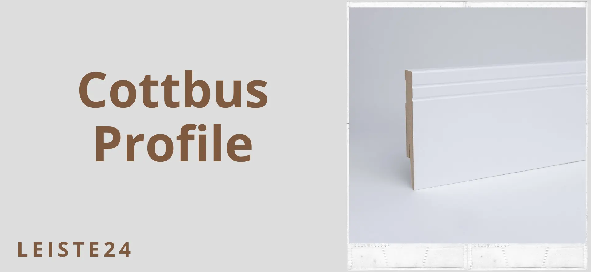 Order modern skirting and skirting boards online with the MDF skirting boards Cottbusser profile in white from leiste24. The high-quality strips with Cottbusser profile are available in the heights 80, 100, 120 and 150mm and impress with their precisely fitting production and a modern look. The integrated cable duct also enables all types of cables to be laid hidden between the wall and the skirting board.