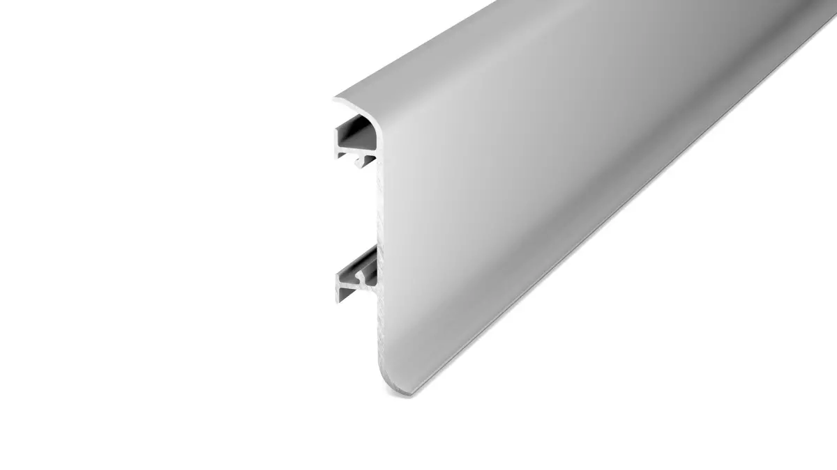 Aluminum skirting board for an elegant and attractive-looking transition between wall and floor. The cable channel built in the clip enables the invisible laying of cables behind the bar.