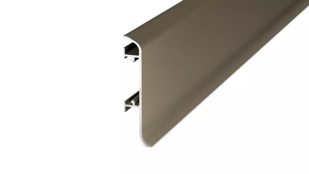 Aluminum skirting board for an elegant and attractive-looking transition between wall and floor. The cable channel built in the clip enables the invisible laying of cables behind the bar.