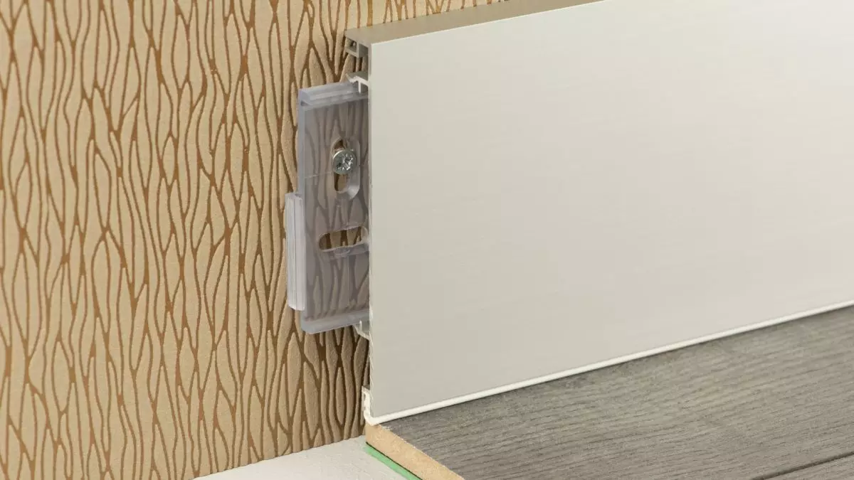 Aluminum skirting board for an elegant and attractive-looking transition between wall and floor. The cable channel built in the clip enables the invisible laying of cables behind the bar.