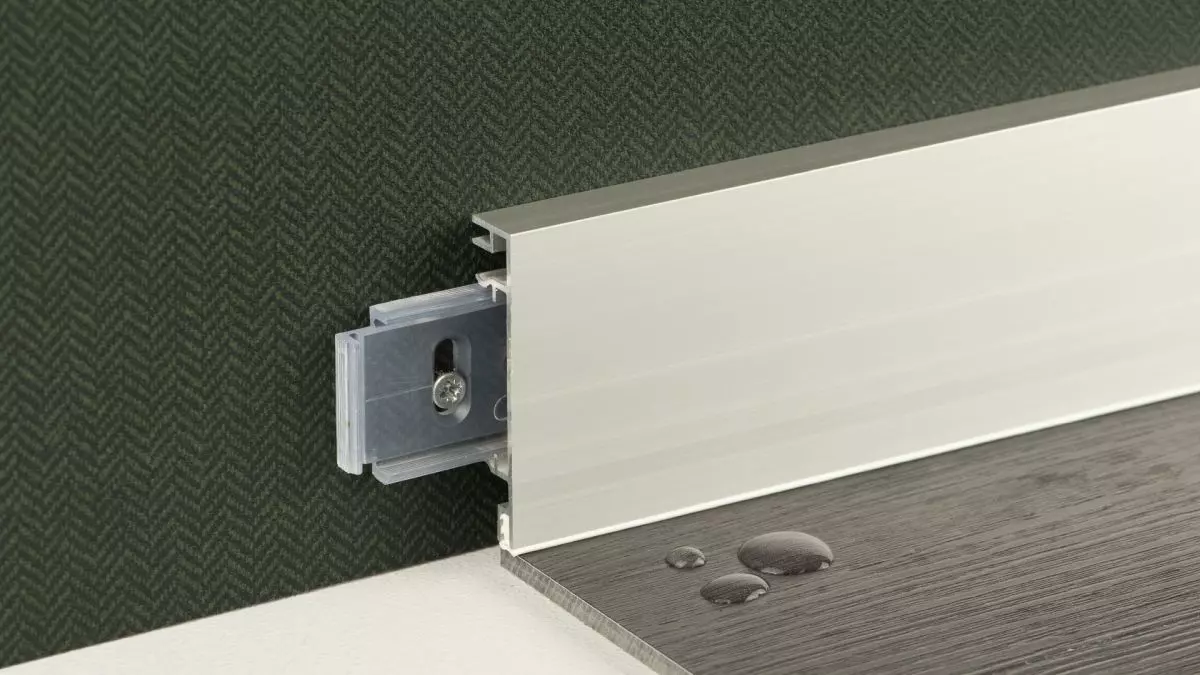 Aluminum skirting board for an elegant and attractive-looking transition between wall and floor. The cable channel built in the clip enables the invisible laying of cables behind the bar.