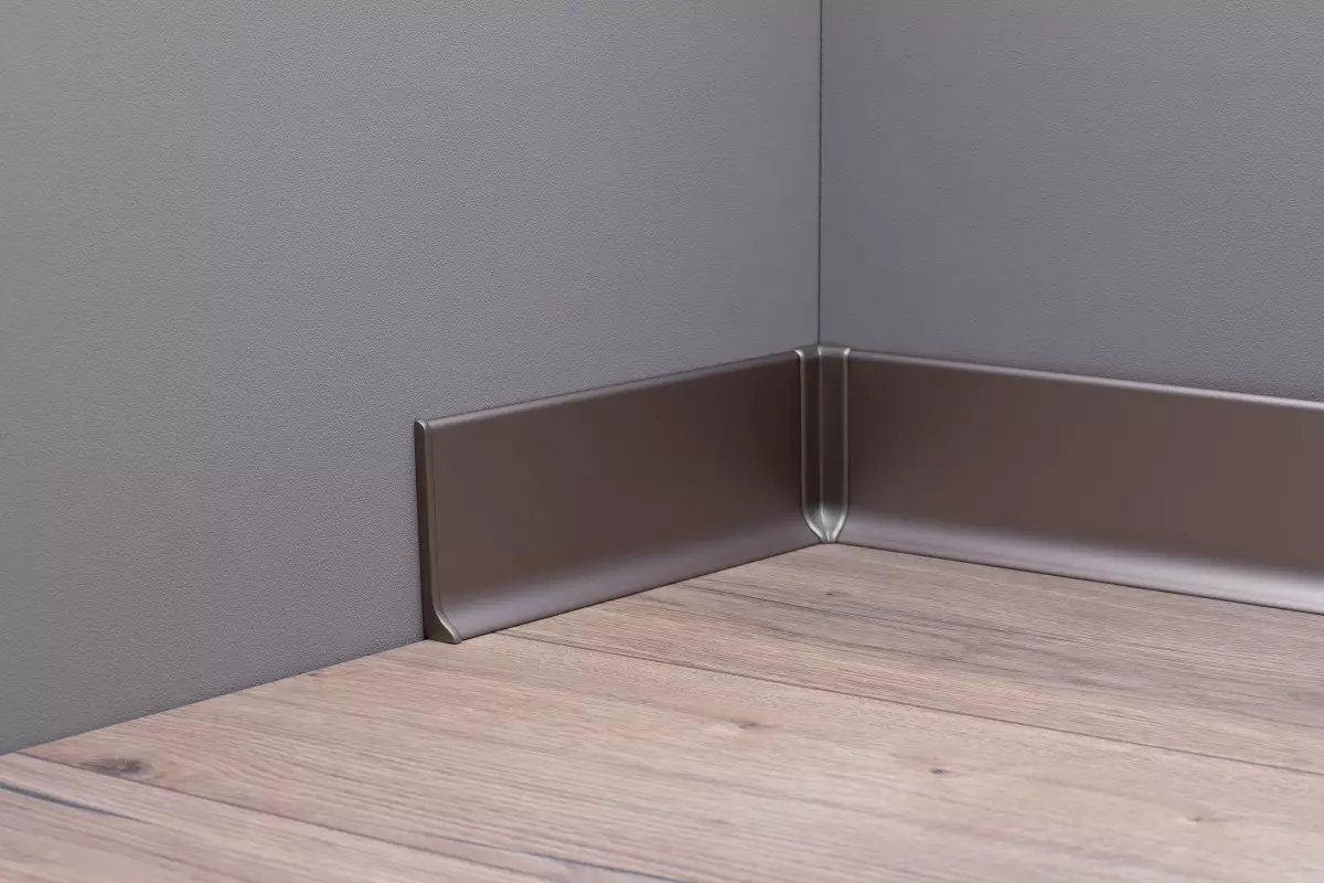 Metal skirting board 70 mm in stainless steel look, for an elegant and attractive-looking transition between wall and floor. The skirting board is made of high-quality aluminium and is therefore extremely stable and durable.