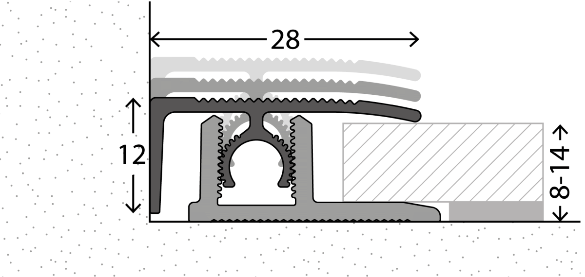 The Profi-Tec clip profile system is designed for flooring thicknesses from 8 to 14 mm. Concealed fastening gives Profi-Tec profiles a perfect appearance without screw holes.Fitting is particularly quick and easy. The top profile snaps into the base profile with the curved toothed joint bar and automatically adapts to the floor covering - variable in height and inclination. The profile fits snugly on both sides, even with large differences in level. At the same time, the curved toothing allows easy removal. The top profile can be detached if necessary and then re-anchored in the base profile.
