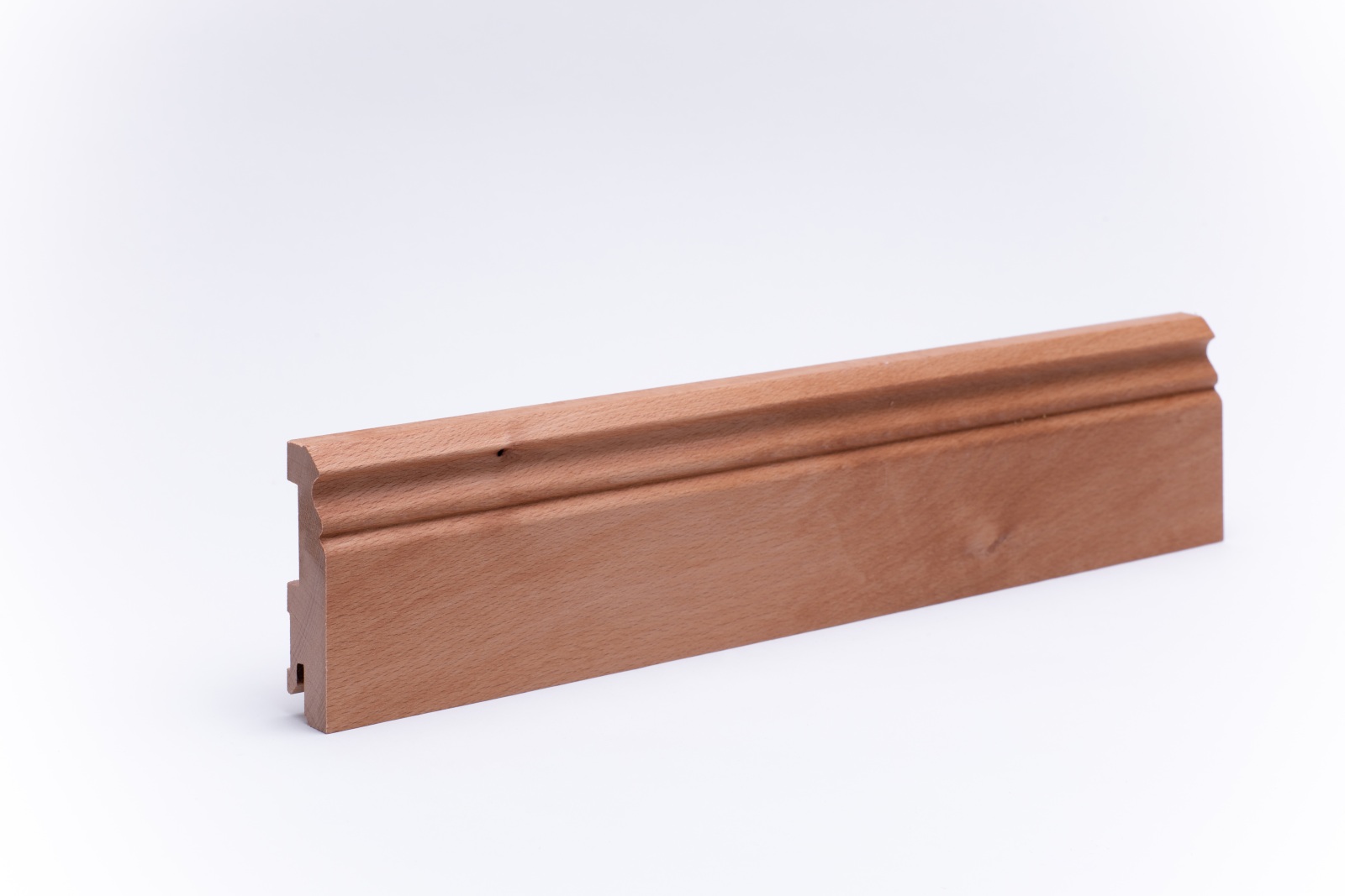 Skirting board made of genuine untreated beech wood with Berlin profile in the dimensions 80mm x 20mm x 1.000 - 2.400 mm. The profiles are produced from one piece of wood from the trunk and give rise to a harmonious finish in wood and colour structure.