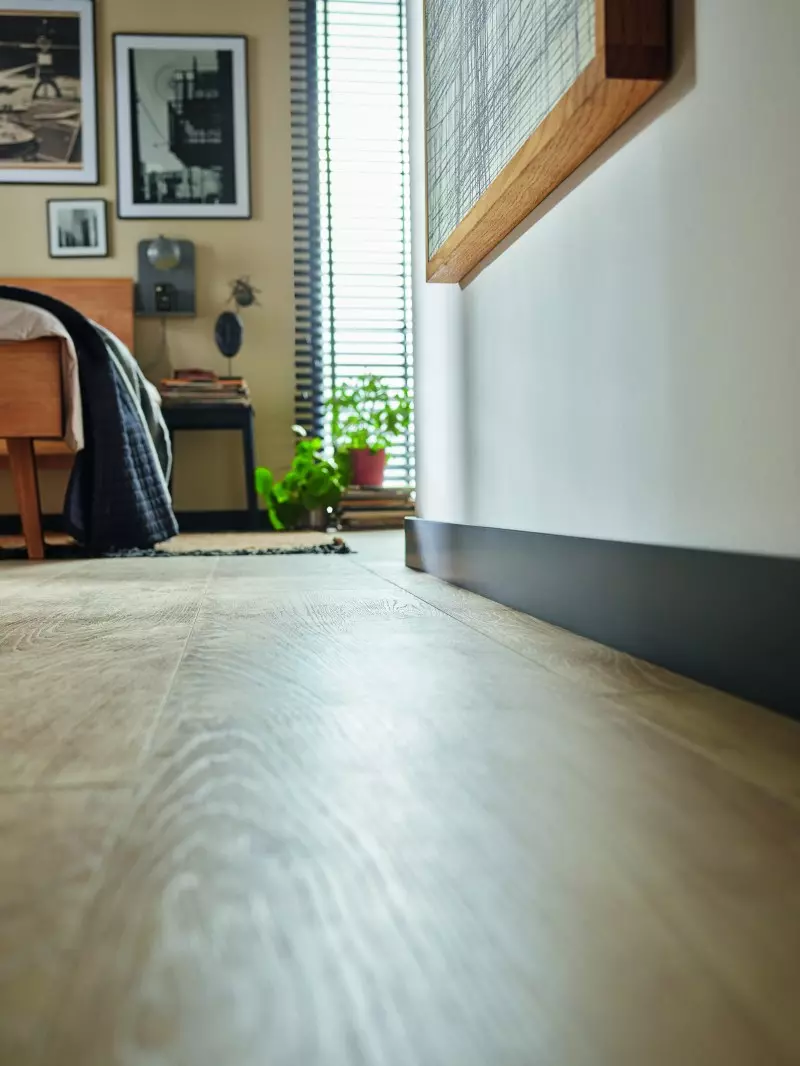 The installation of the Espumo skirting board is particularly quick and easy, as it is only attached to the wall with mounting adhesive. Thanks to a hidden cable guide, it is also possible to make annoying cables disappear.