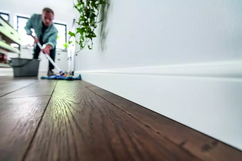 The installation of the Espumo skirting board is particularly quick and easy, as it is only attached to the wall with mounting adhesive. Thanks to a hidden cable guide, it is also possible to make annoying cables disappear.