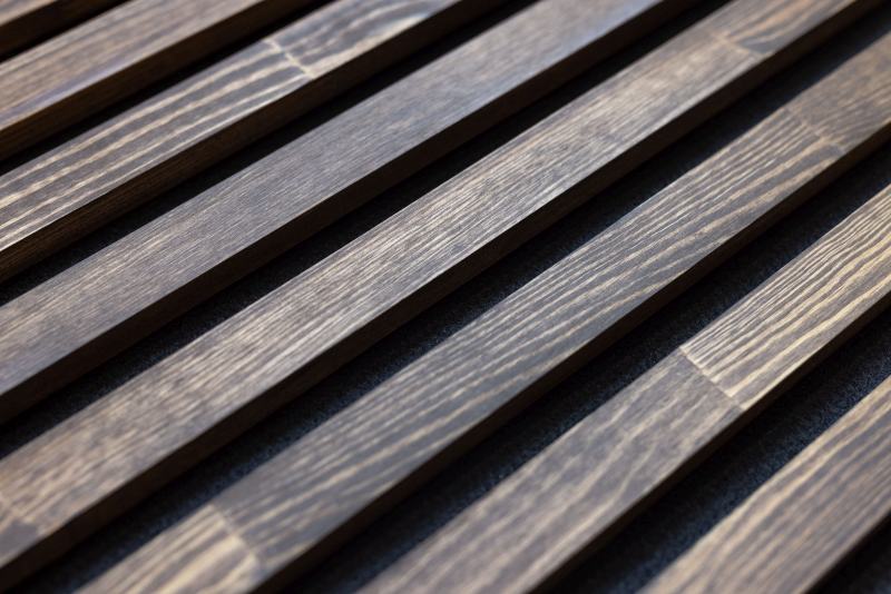 Solid wood panels - slat wall as wall and ceiling cladding Dimensions: 2600 mm x 400 mm x 20 mm Felt mat in black 8 mm thick Lamellas made from finger-jointed solid oak slats Surface oak PEPPER Black Dimensions of the slats 27mm wide and 12mm thick Spacing between the slats 18mm Wall panels completely pre-assembledThe assembly