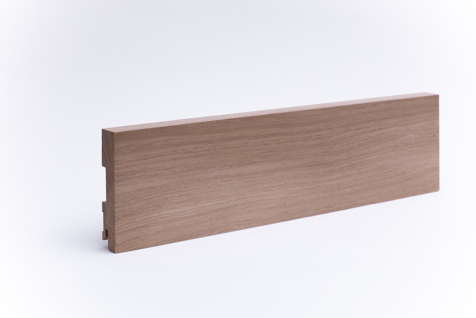 120 mm high skirting board made of solid oak with square profile. Planed and sanded. The skirting boards are made from one piece, as the trunk has grown. This creates a harmonious picture in the wood and color structure. Knots are possible.