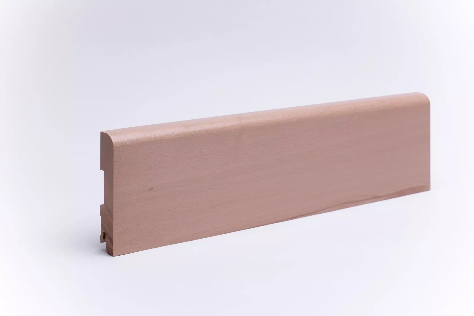 Skirting board made of genuine varnished beech wood with a rounded front edge in the dimensions 120mm x 20mm x 2400mm. The profiles are produced from one piece of wood from the trunk and give rise to a harmonious finish in wood and colour structure.