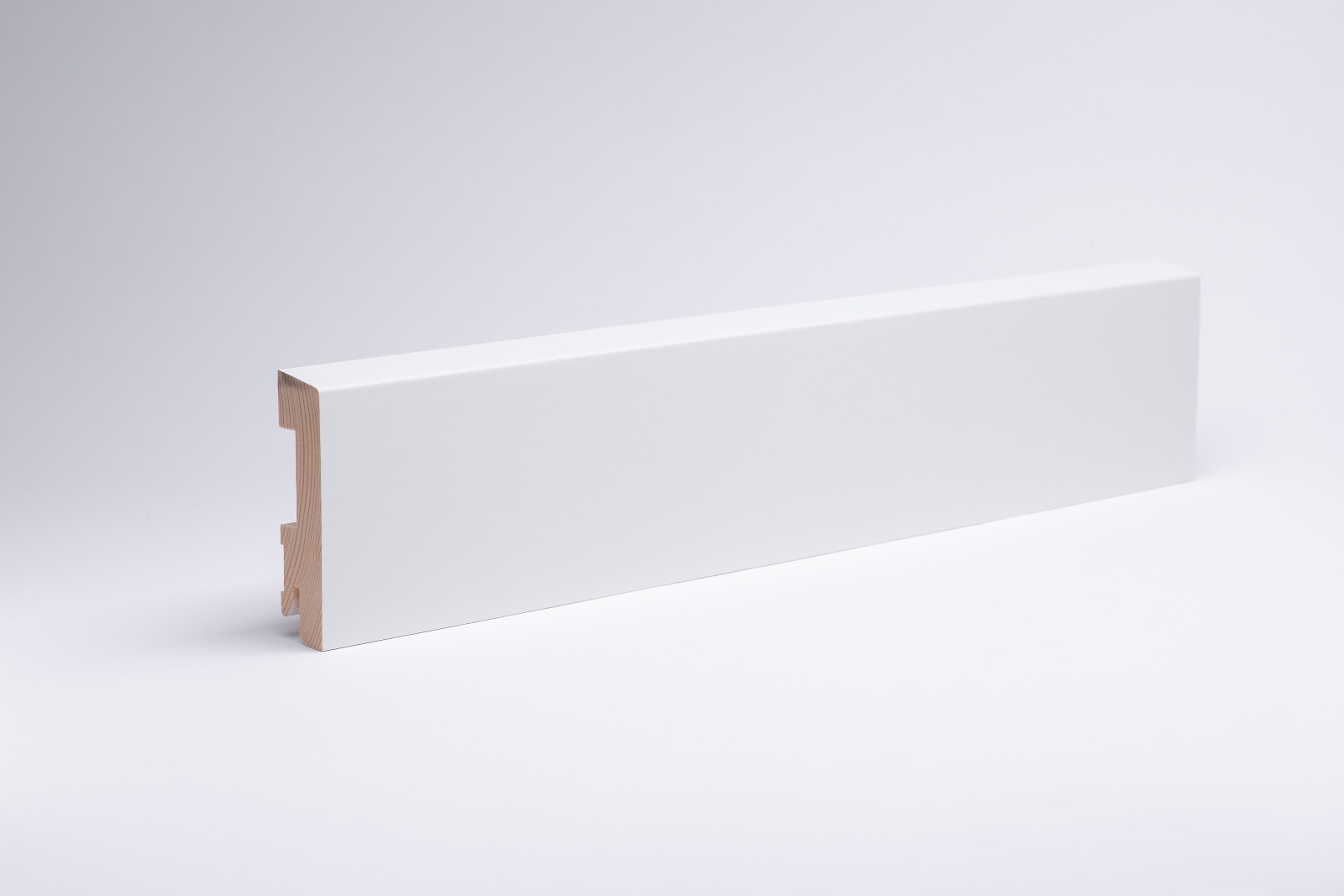 Solid wood skirting 80 mm with chamfered front edge white varnished RAL 9016
