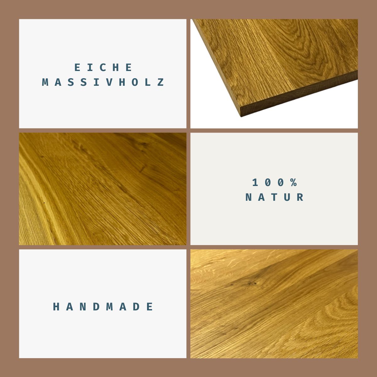 Our solid wood tops in a thickness of 40 mm made of oak are glued by hand and provide a real eye-catcher and a great room ambience. Thanks to the lively grain of the oak, you get a product with a natural and authentic look. You have the option of configuring your board according to your ideas. The oak wood offers many positive properties, an intense grain and is considered very durable. By nature, oak is very weather-resistant and hard-wearing. The robustness, durability and longevity are particularly outstanding properties. The wood is technically dried to approx. 8-12% and is therefore free of vermin and pests, making it perfect for indoor use.
