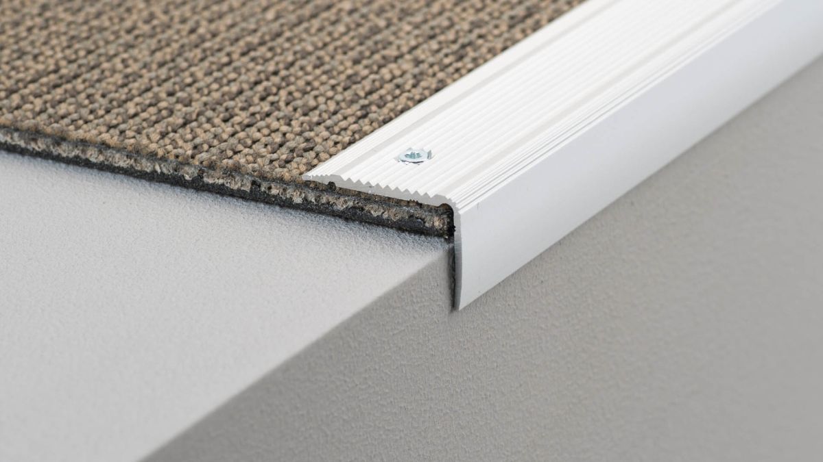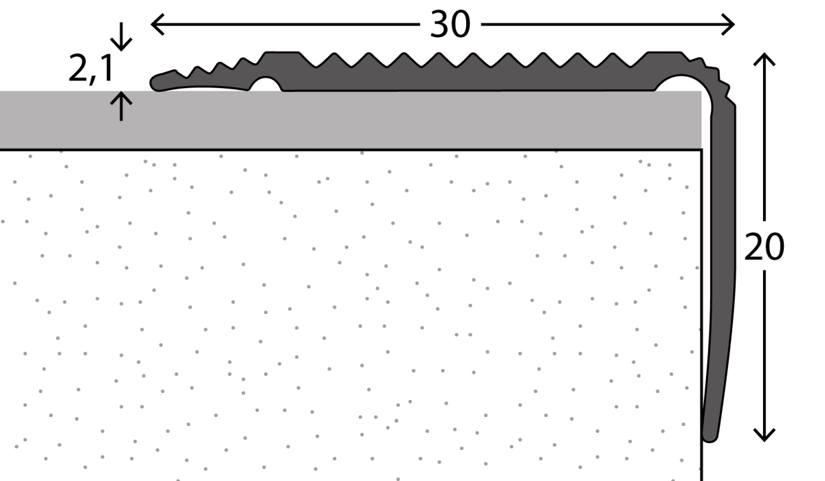 The stair nosing profile 30 x 20 mm reliably protects the edges of the floor covering on a step edge. The grooved surface also increases safety on the step edge.