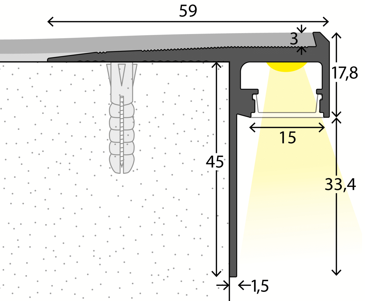 Das Profil wird auf die wie vor genannten Stufenkanten mittels geeigneter Dübel und Senkkopfschrauben passgenau auf die vorhandenen Stufen über dem verlegten Bodenbelag aufgeschraubt. Vergewissern Sie sich das etwas Platz für mögliche Kabelverlegungen für die