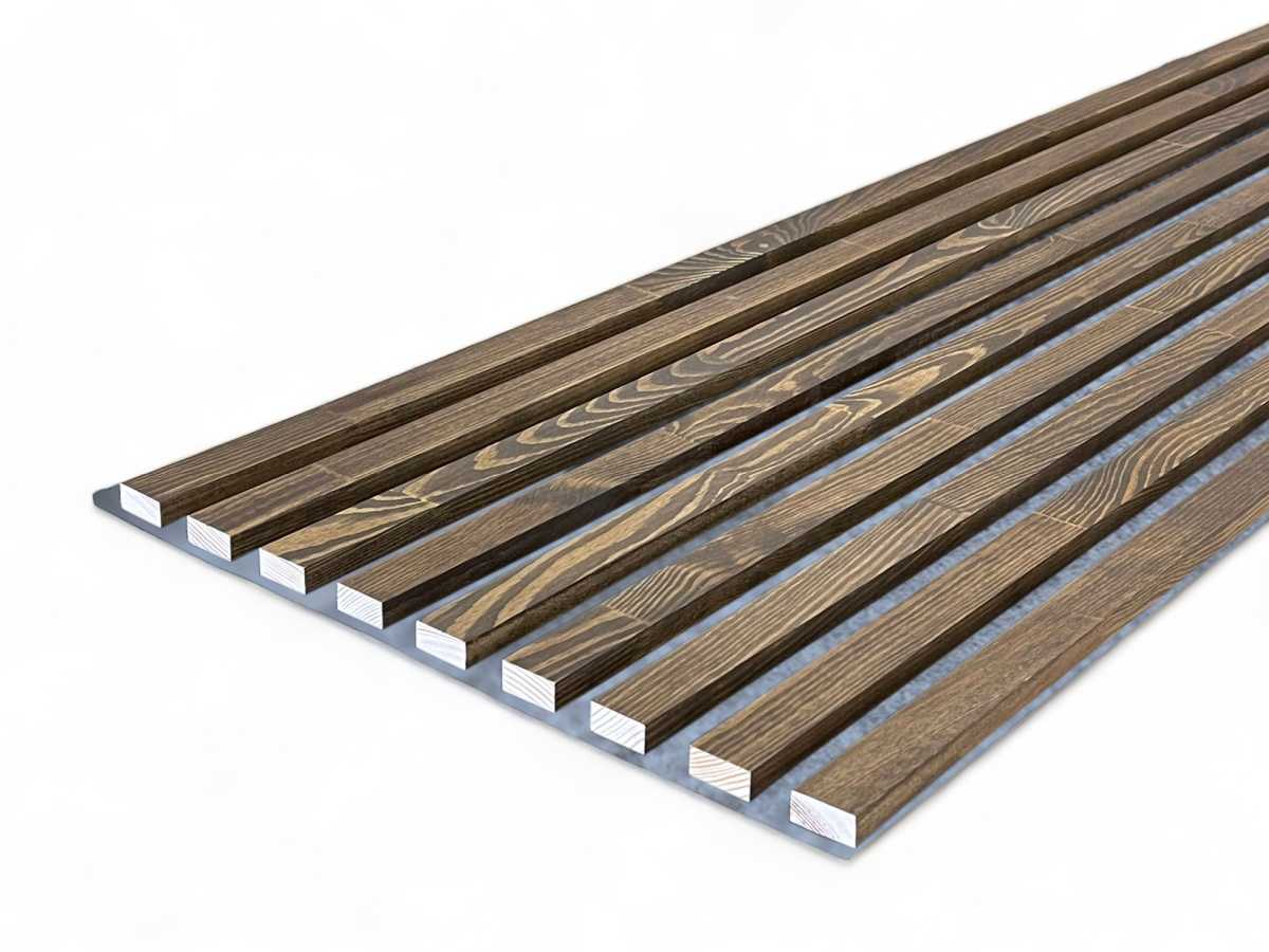 Lamellenverkleidung - Wandverkleidung - Massivholz Akustikpaneel 2600 x 400 mm Kiefer WALNUT - Akustikfilz Grau