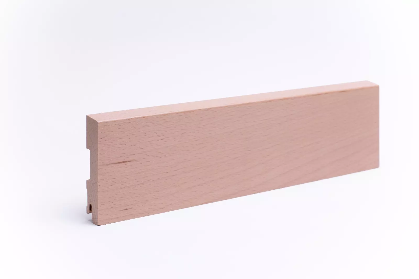 120mm hohe Sockelleiste aus massivem Buchenholz mit abgeschrägter Vorderkante und lackierter Oberfläche . Die Leisten werden aus einem Stück, wie der Stamm gewachsen ist, gearbeitet. Asteinschlüsse sind möglich.