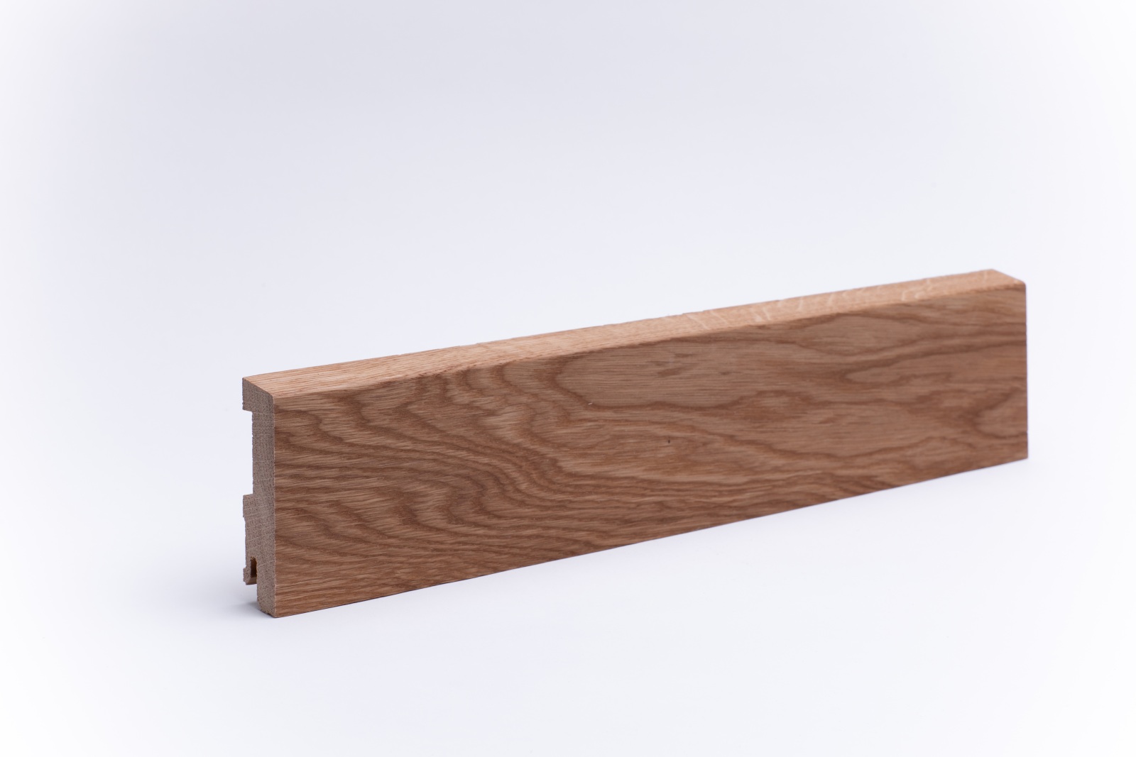 80 mm hohe Sockelleiste aus massivem Eichenholz mit abgeschrägter Vorderkante. Gehobelt und geschliffen. Die Leisten werden aus einem Stück, wie der Stamm gewachsen ist, gearbeitet. Dadurch entsteht ein harmonisches Bild in der Holz- und Farbstruktur. Asteinschlüsse sind möglich.