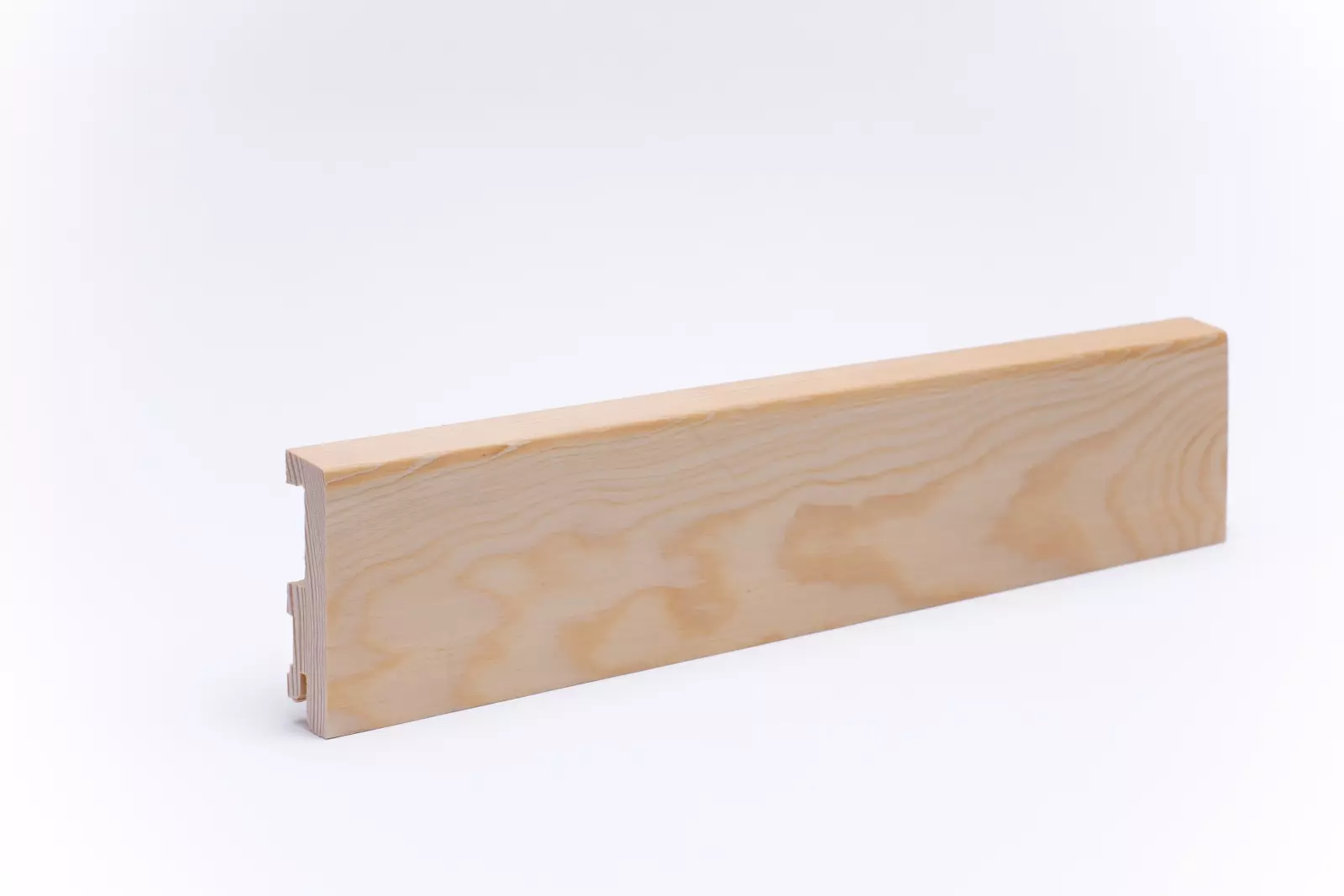 80 mm hohe Sockelleiste aus massivem Kiefernholz mit abgeschrägter Vorderkante. Gehobelt und geschliffen. Die Leisten werden aus einem Stück, wie der Stamm gewachsen ist, gearbeitet. Dadurch entsteht ein harmonisches Bild in der Holz- und Farbstruktur. Asteinschlüsse sind möglich.