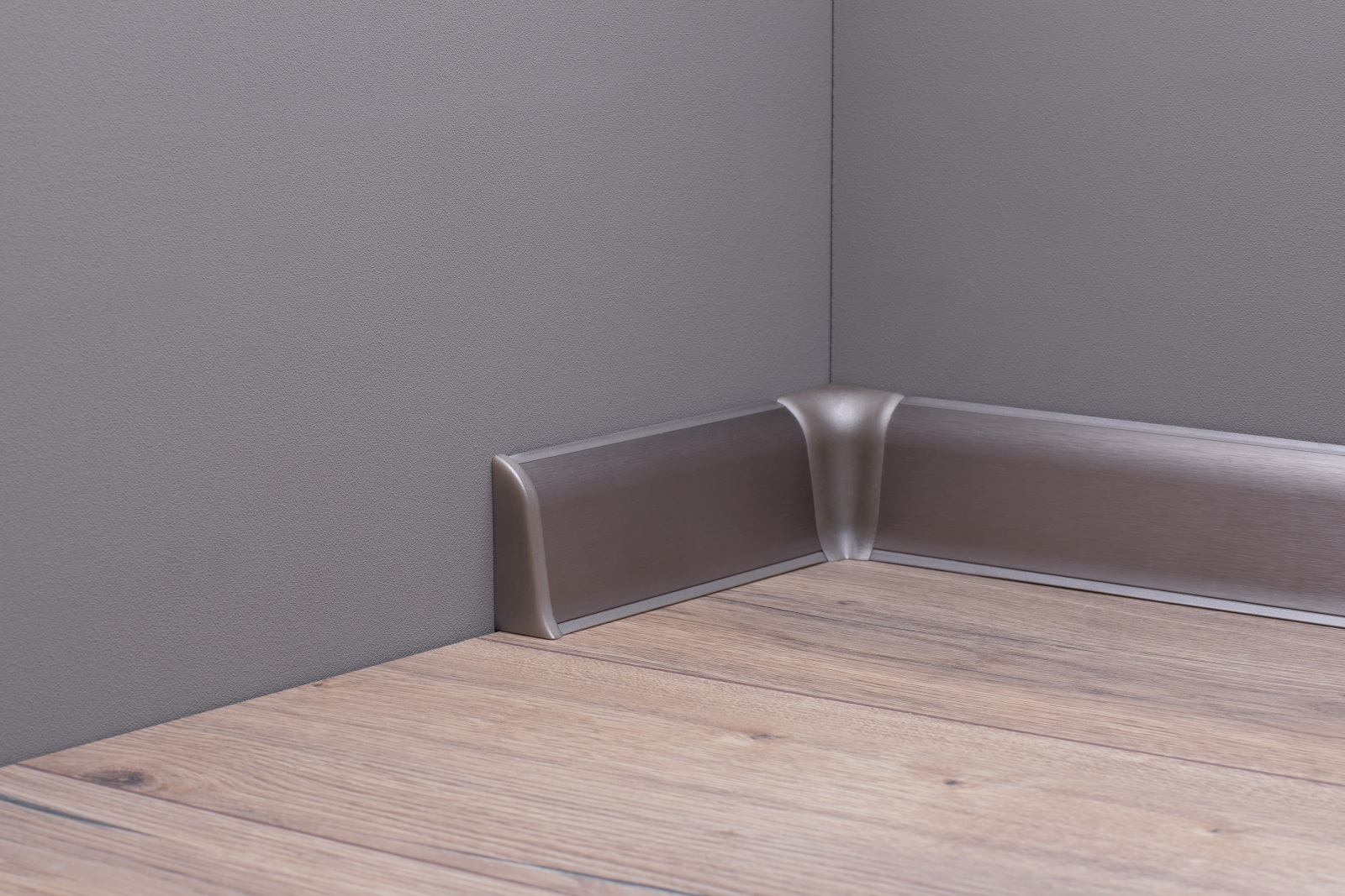 Metallsockelleiste aus Aluminium in Edelstahl Optik gebürstet mit integrierter Dichtlippe, zum Schutz vor Staub und Feuchtigkeit.