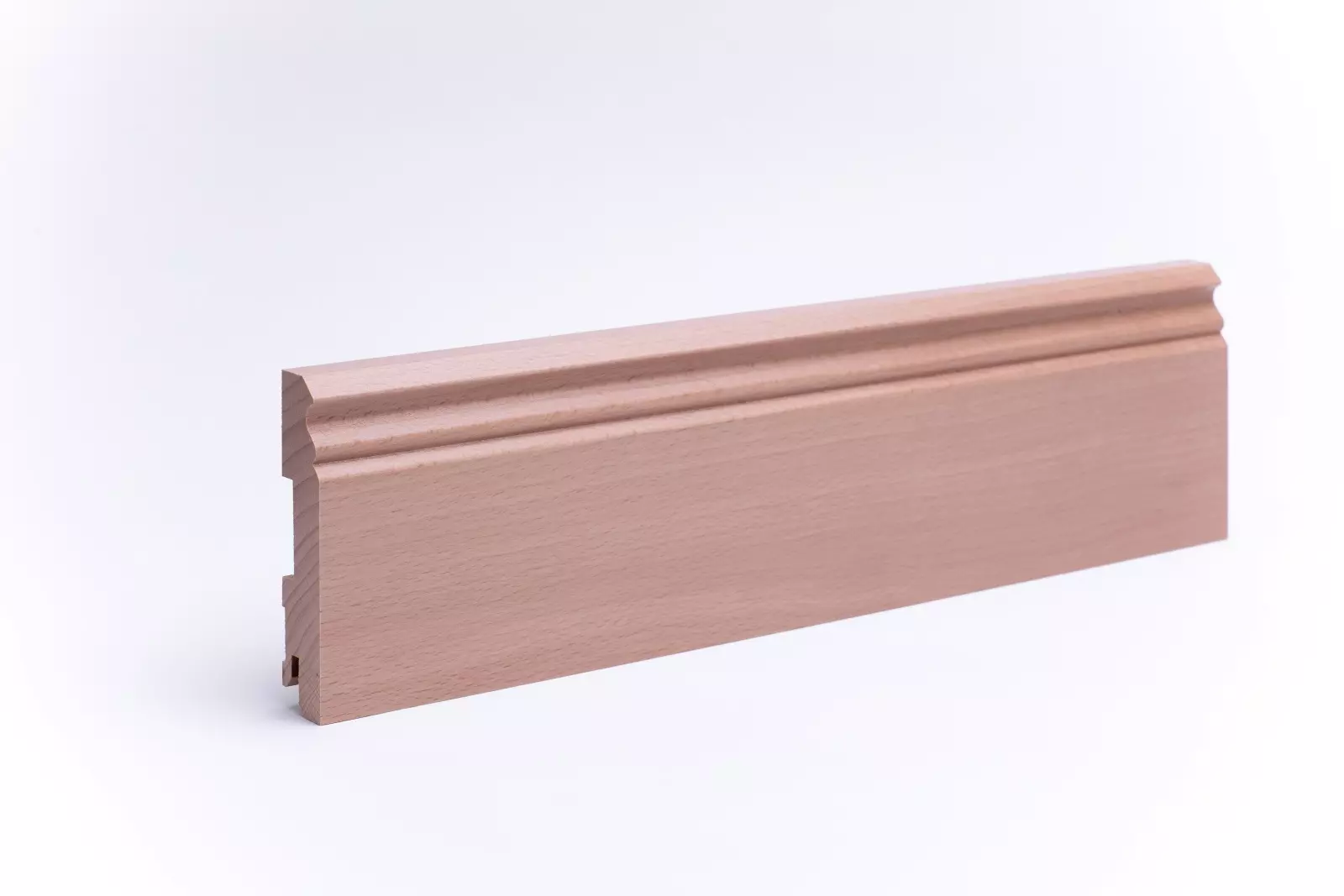 120mm hohe Sockelleiste aus massivem Buchenholz als Berliner Profil mit lackierter Oberfläche. Die Leisten werden aus einem Stück, wie der Stamm gewachsen ist, gearbeitet. Asteinschlüsse sind möglich.