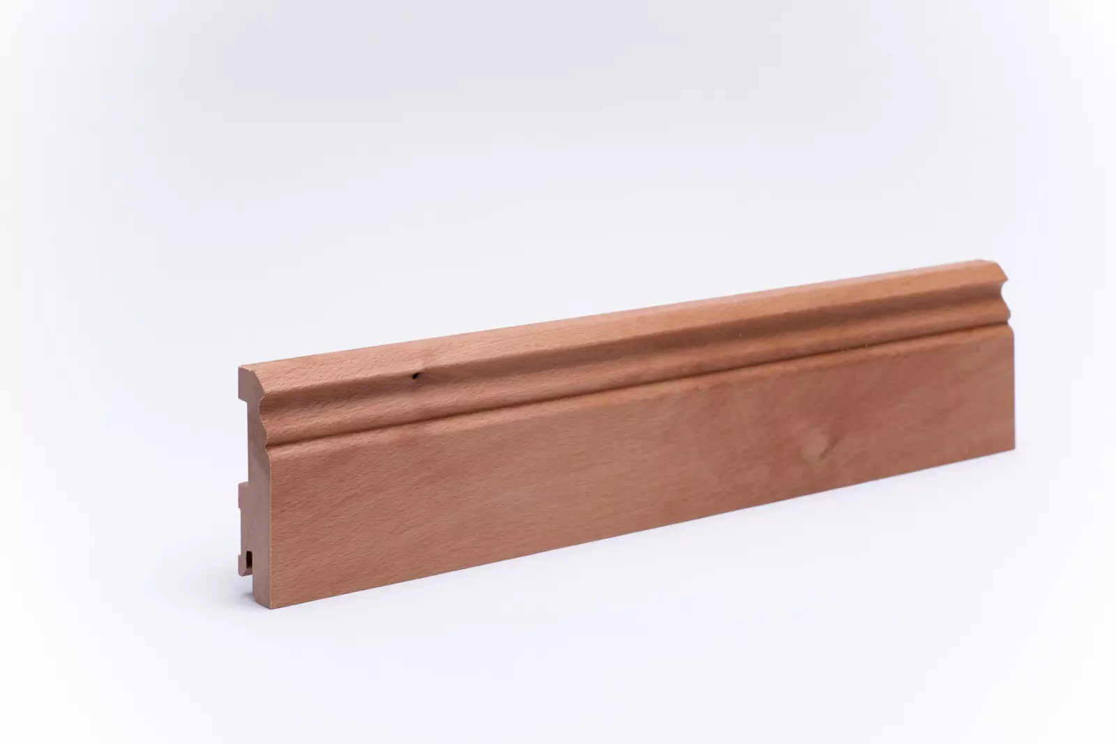 80mm hohe Sockelleiste aus massivem Buchenholz als Berliner Profil mit geölter Oberfläche. Die Leisten werden aus einem Stück, wie der Stamm gewachsen ist, gearbeitet. Asteinschlüsse sind möglich.