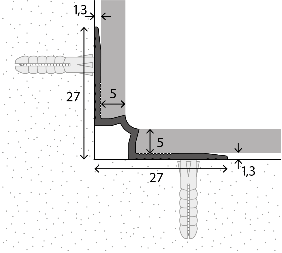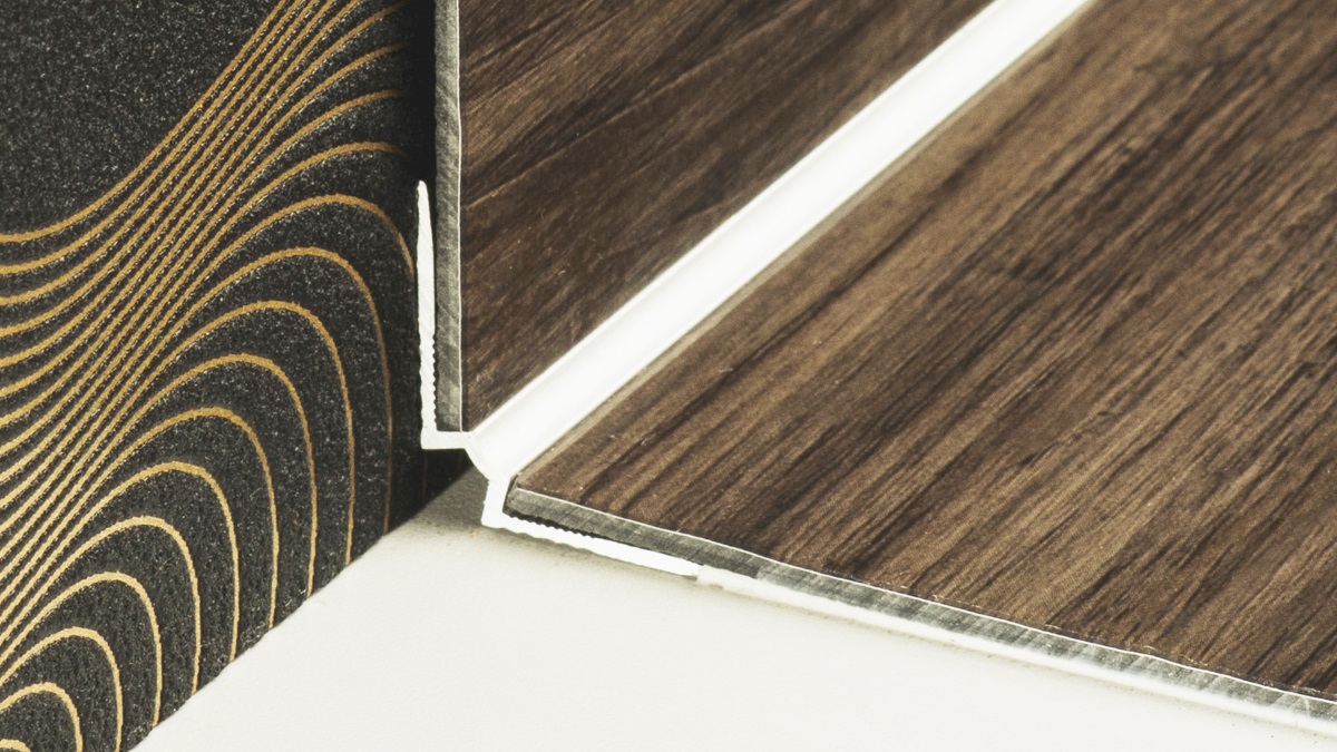 Treppenkanten für Designbeläge bis 5 mm, für die vollflächige Verlegung von Designbelägen auf Treppenstufen. Die darauf abgestimmten Innenwinkel schützen die Kanten des Belags auch in der Innenecke zwischen Tritt- und Setzstufe.