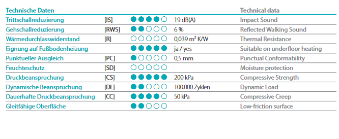 - Antistatische Eigenschaften, dadurch geeignet für Büroräume, auf Holzbalkendecken und unter Laminat