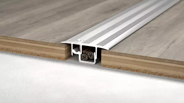 Übergangsprofil aus Aluminium mit integriertem Kabelkanal, in sehr langlebiger Profiqualität. Bestehend aus Unterprofil und Oberprofil zum Schrauben - für gleich hohe Übergänge oder zum Ausgleich von Höhenunterschieden bis 3 mm.