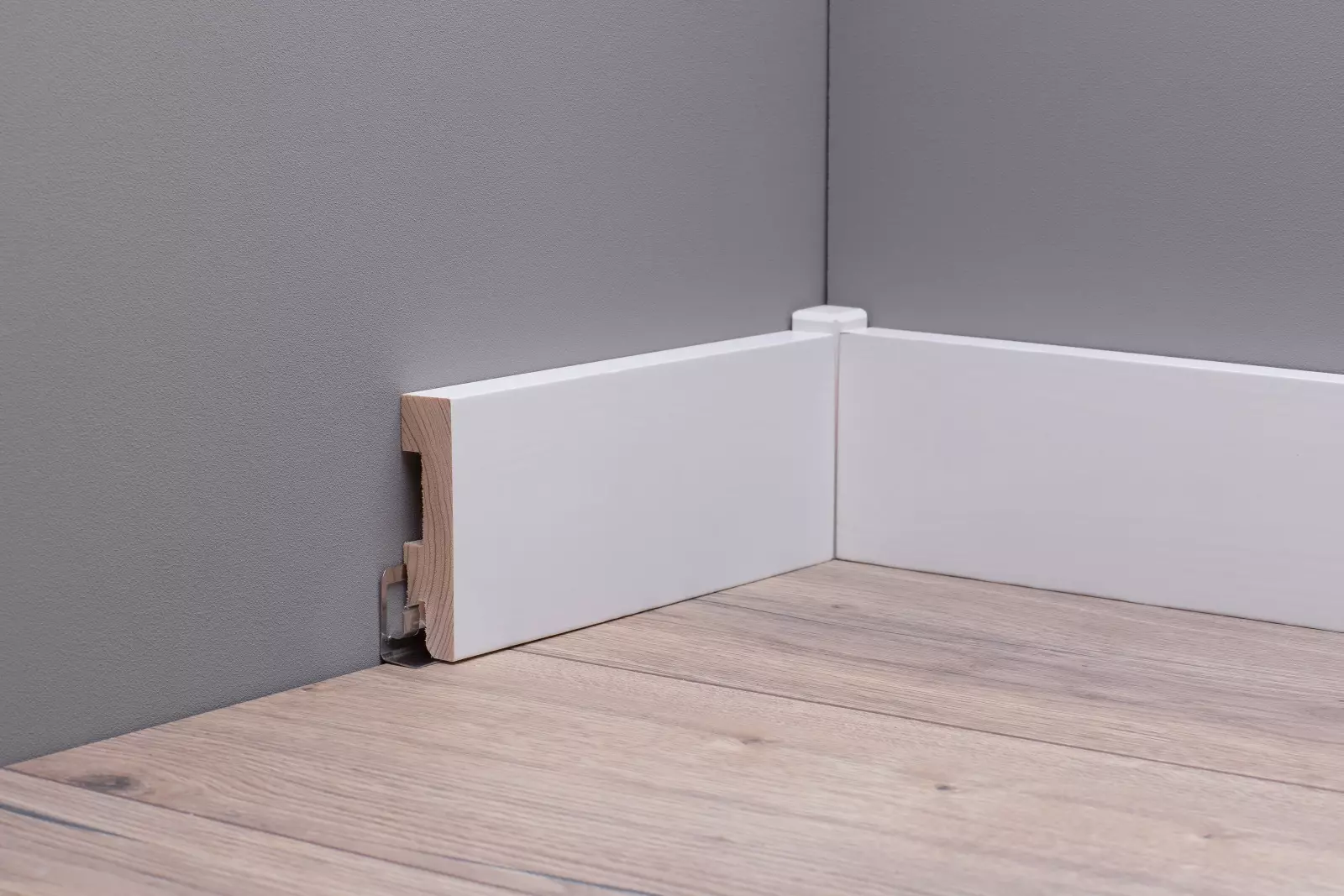 Unsere Massivholzsockelleisten 80 mm sind in der Standardausführung inklusive Clipfräsung.